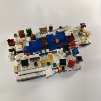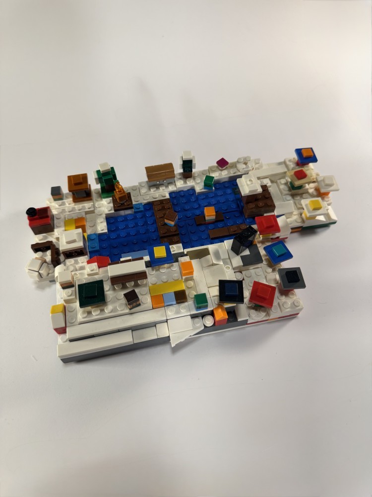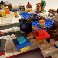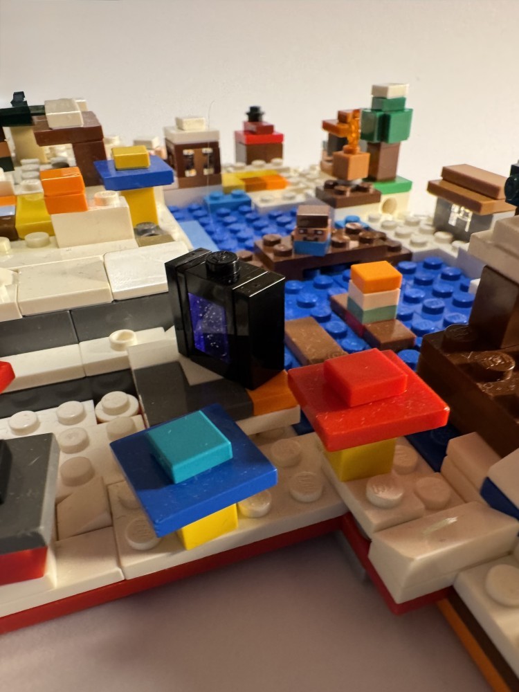 Mini minecrafti teemaline küla. Veekogu ümbritsevad majad, mägi, põllud ja muu. Leia pildilt lammas!