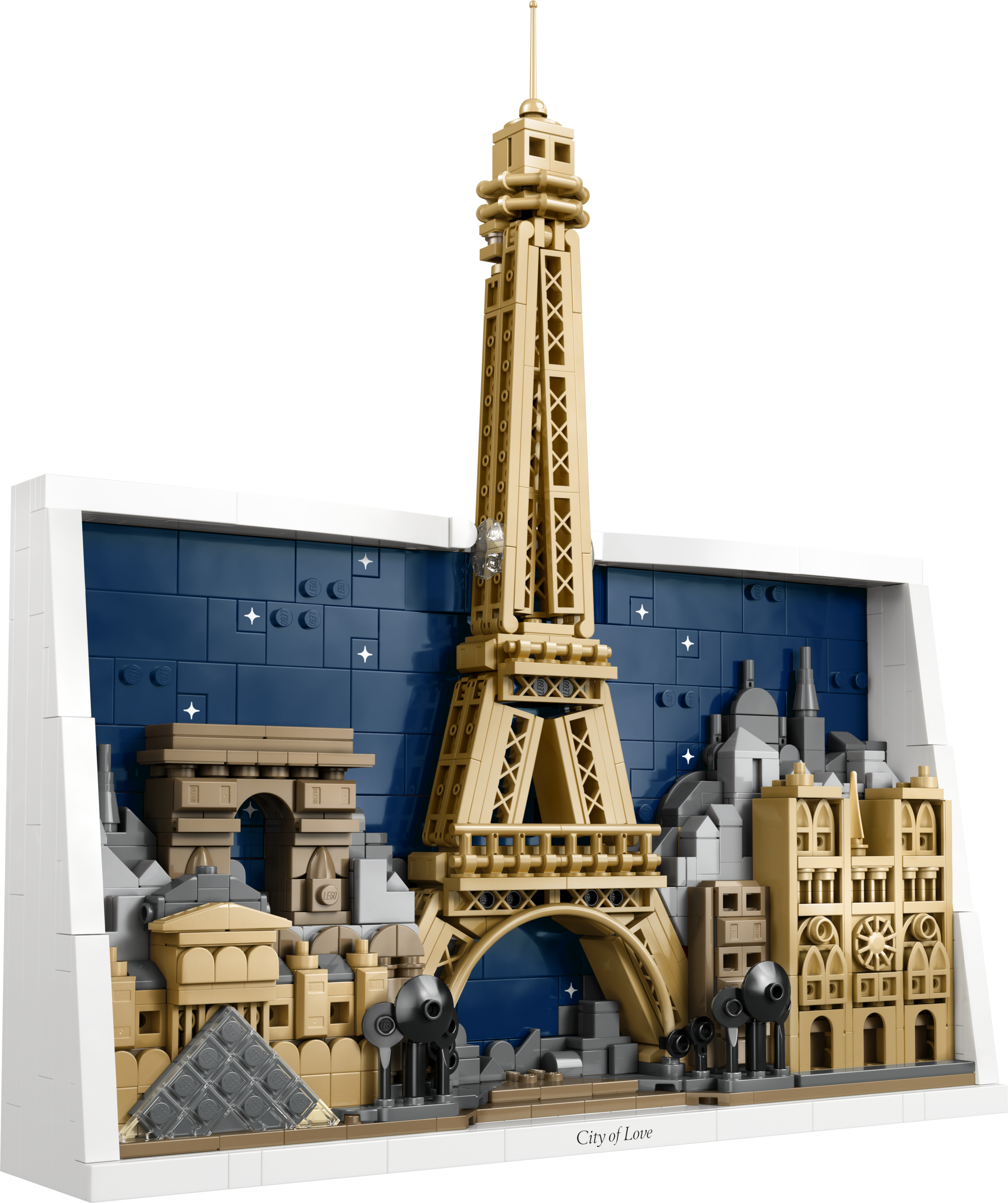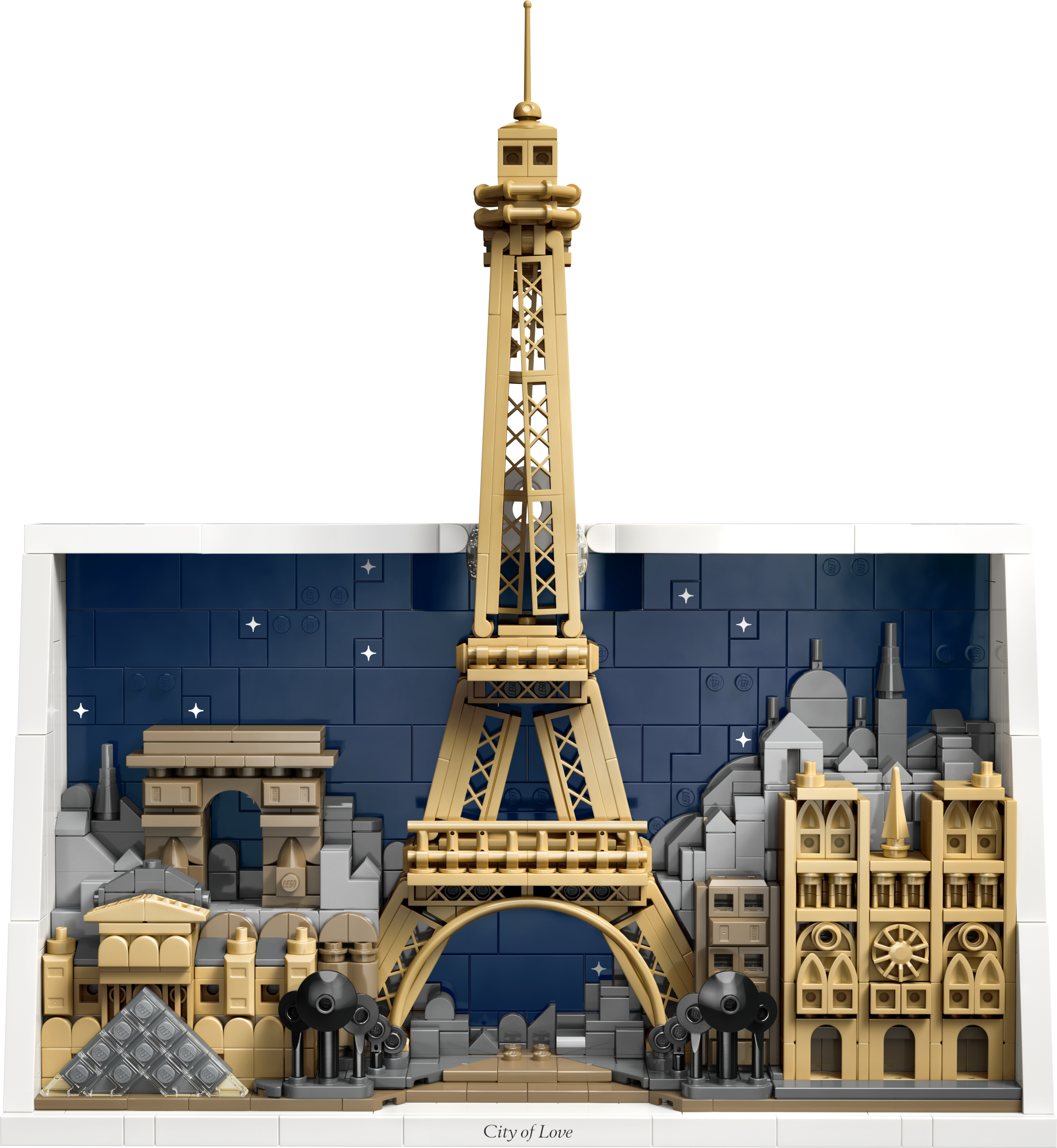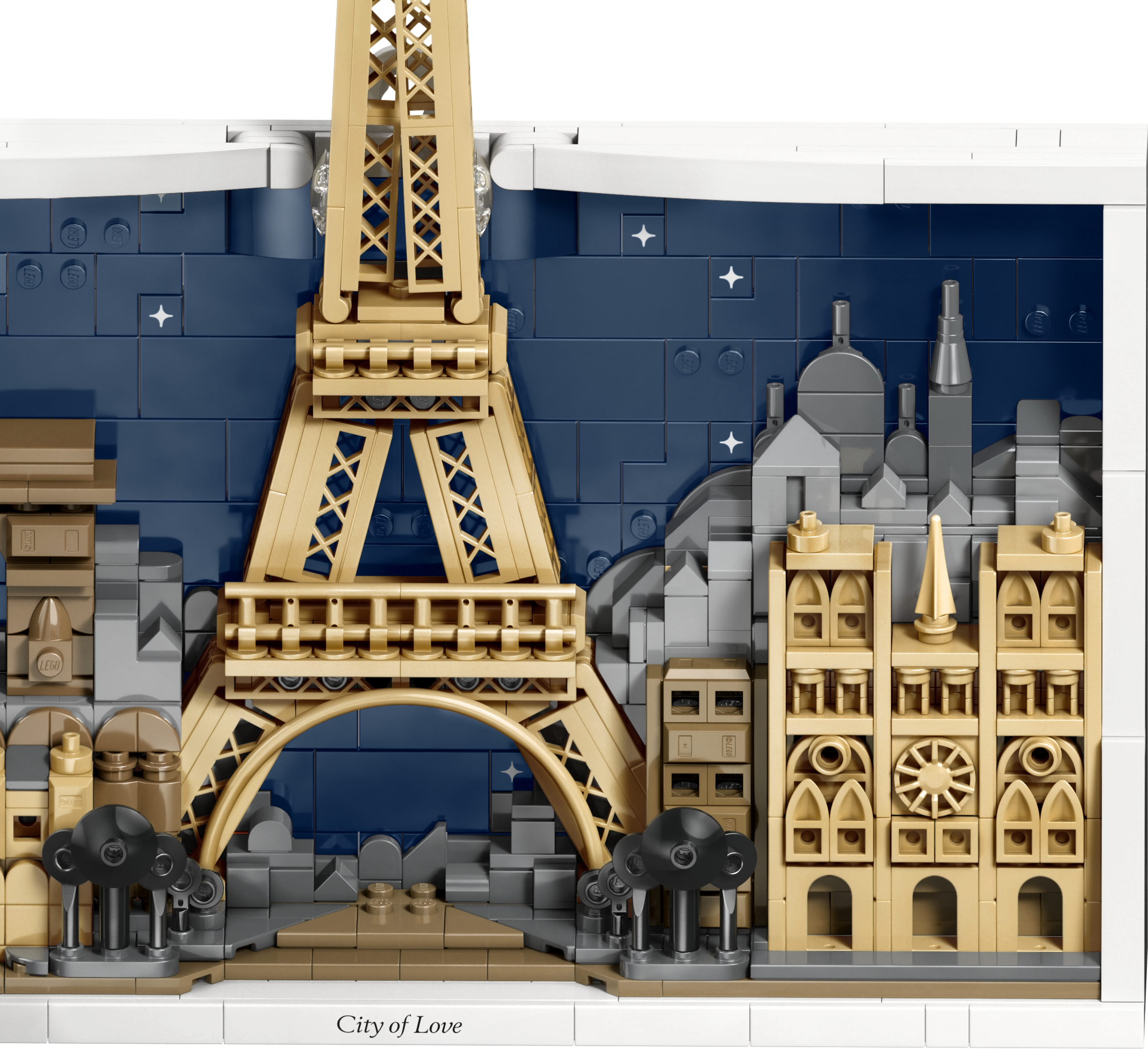 - Avasta Pariisi detaile – LEGO® kodukaunistuskomplekt Pariis – armastuse linn (21064) sisaldab nelja Pariisi arhitektuuriikooni linna silueti ja tähti täis taeva taustal, mis on valgetest klotsidest raamis