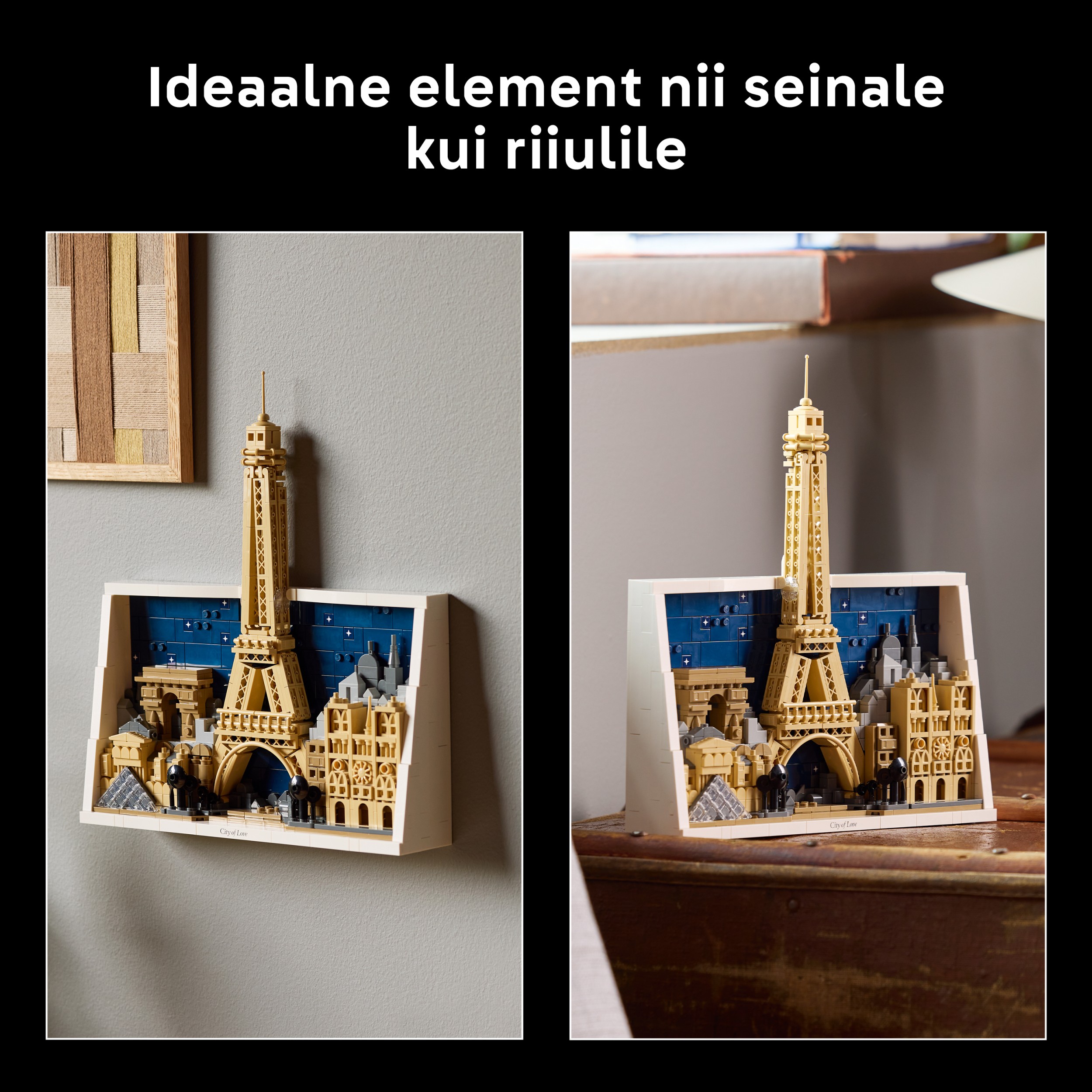 - Ehita ja esitle – See täiskasvanutele mõeldud lõõgastav tegevus võimaldab sul ehitada raamitud kunstiteose, kinnita kaunistatud „Armastuse linna“ klots esiplaanile ja esitle seda seina- või kodukaunistusena kõikjal