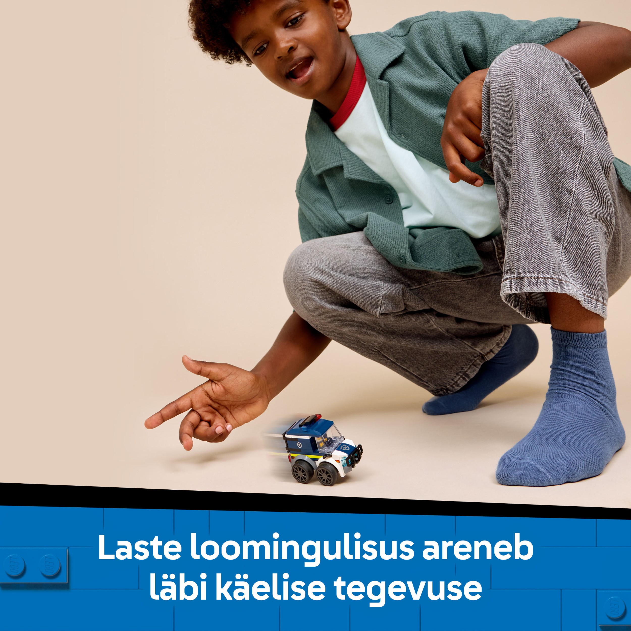 - POLITSEIMÄNGUASI 5+AASTASTELE – Alusta põnevaid politseipatrulli seiklusi selle LEGO® City Sõidukid – politseiveoki (60481) ehituskomplektiga väikestele ehitajatele