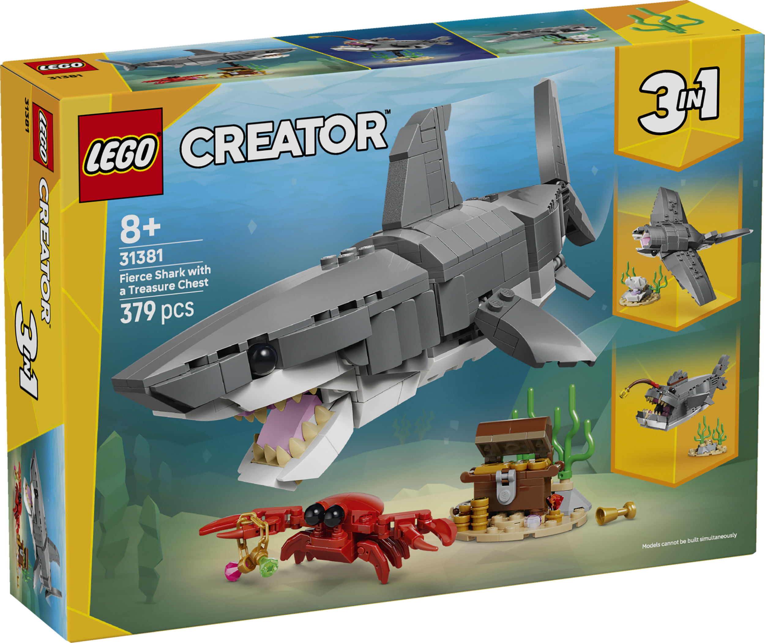 - Kolm ühes mereloomad – LEGO® Creator sarja kolm ühes Raevukas hai aardekirstuga (31381) ehitusmänguasi võimaldab alates 8-aastastel poistel ja tüdrukutel ehitada ja ümber ehitada 3 ookeanilooma figuuri samade klotsidega
