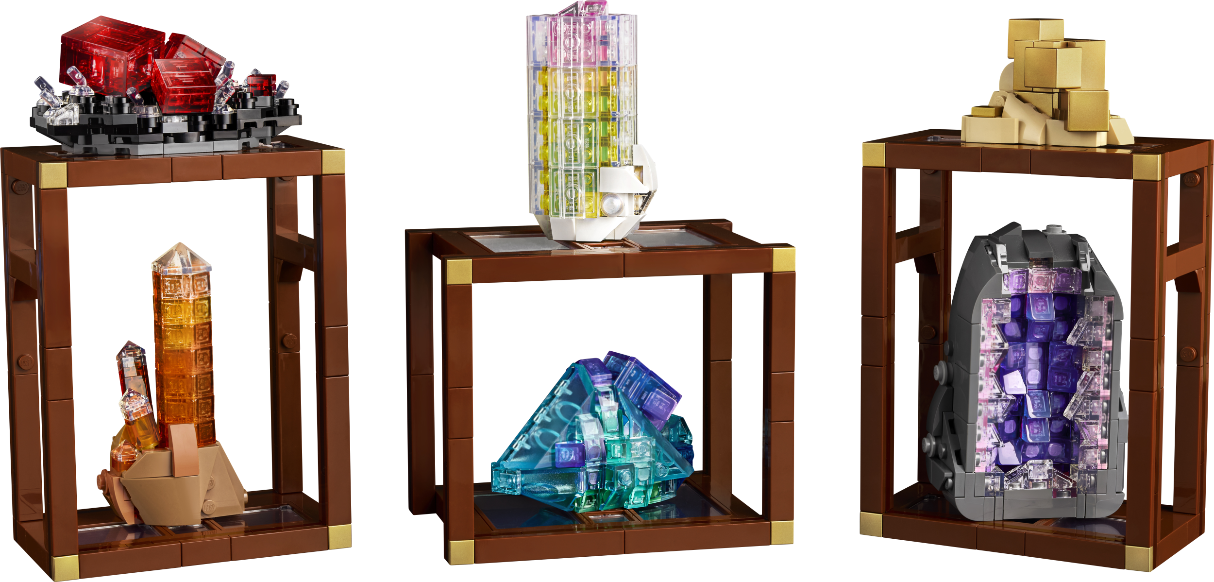 Kasuta nutikaid ehitustehnikaid ja läbipaistvaid LEGO klotse, et luua mudelid kuldsest püriidist, lillast ametüsist, sinisest fluoriidist, arbuusturmaliinist, punakasroosast rodokrosiidist ja mandariinkvartsist. Pane kokku 3 eraldiseisvat riiulit ja aseta oma looming riiulitele. Paiguta riiulid vastavalt oma soovile ja vaheta kive, et oma väljapanekut muuta.