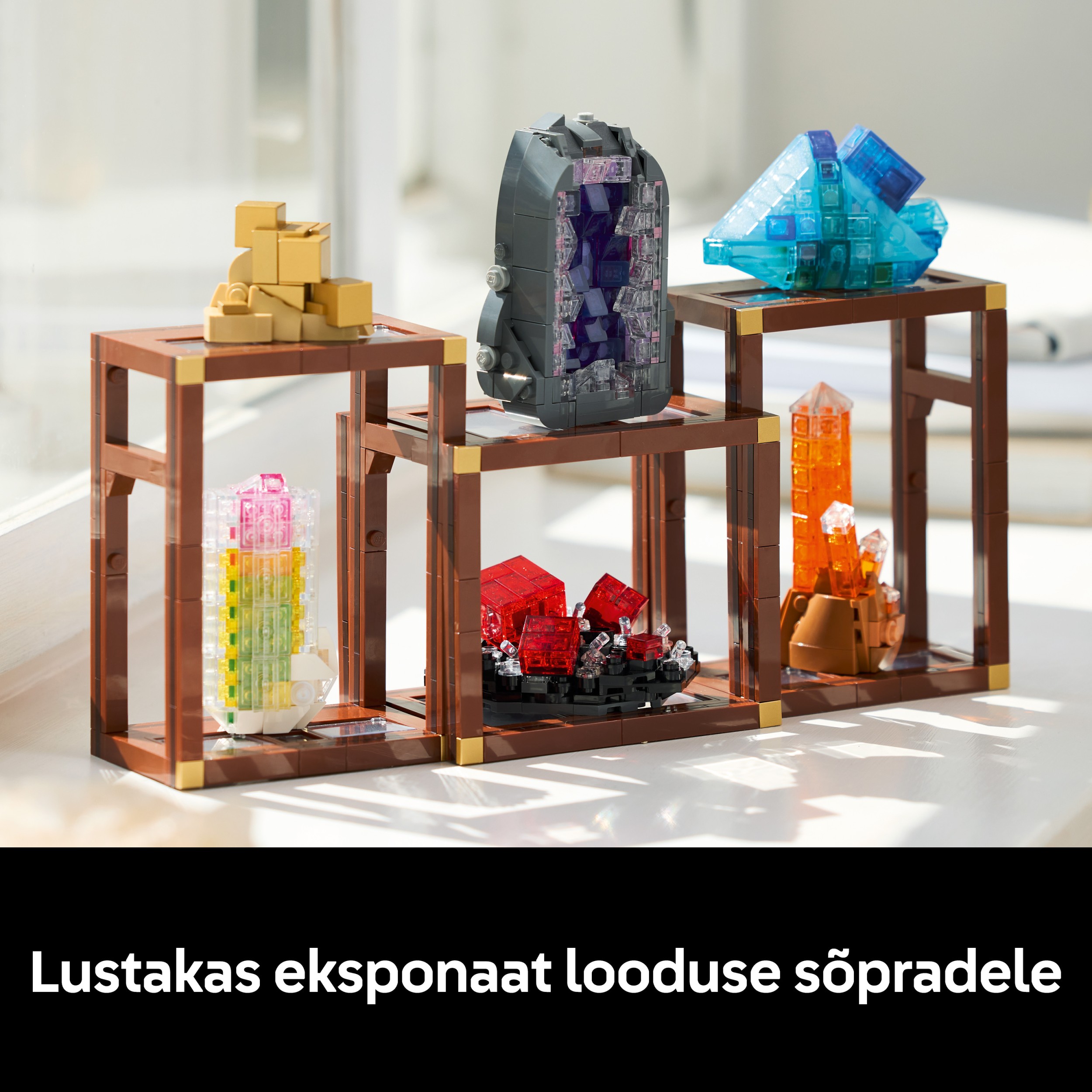 - Ainulaadne elutoa sisekujundus – tähista looduse ilu LEGO® Ideas Mineraalide kollektsiooniga, mis sisaldab 6 mineraali värvilisi mudeleid ja 3 riiulit