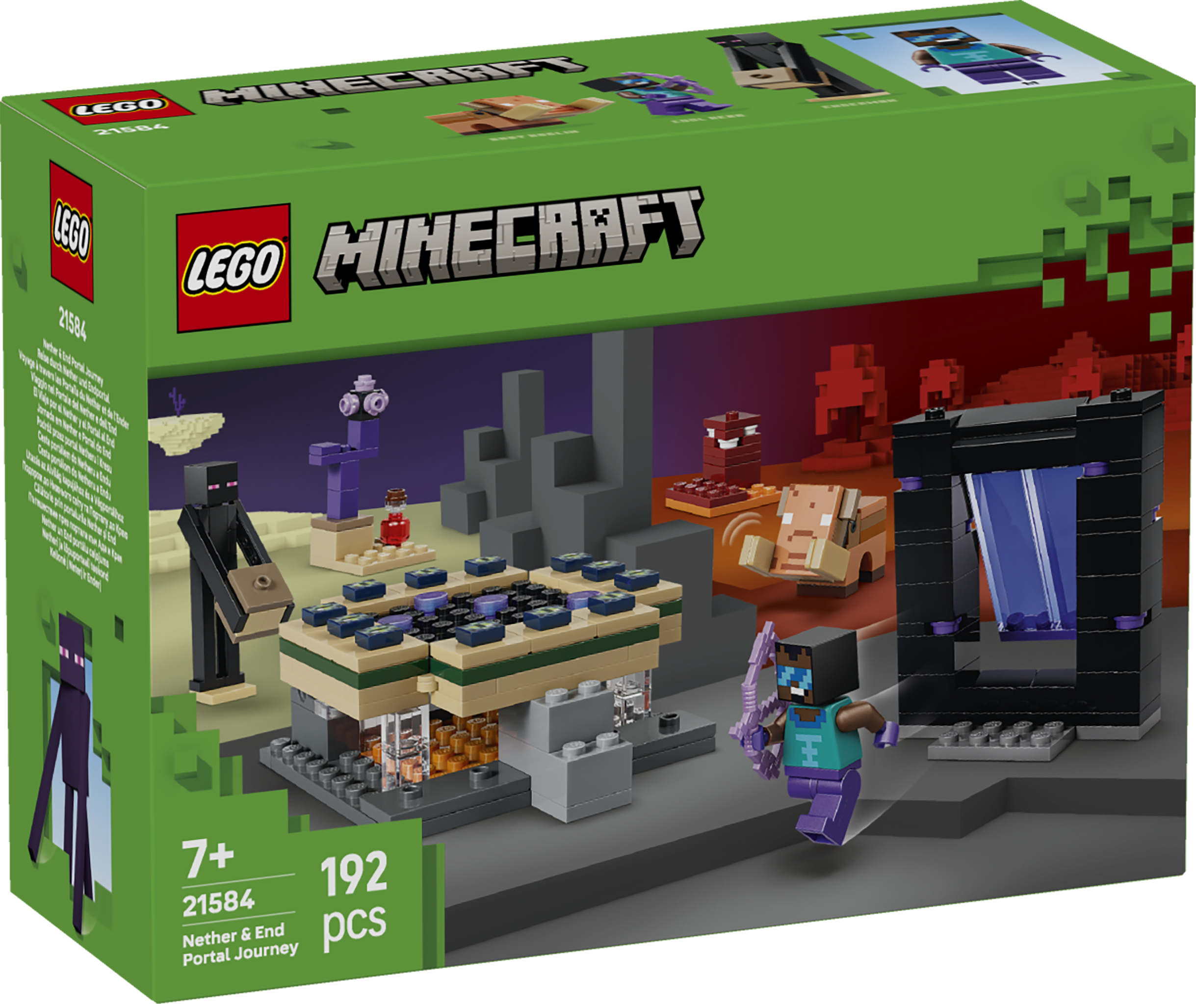 - 3 tegelaskuju, 2 portaali – aktiveeri mänguportaalid ja astu neist läbi, et leida mõlemast bioomist LEGO® mudel ja Minecraft® tegevus laheda kangelase minifiguuriga, lisaks Endermani ja hoglinibeebi figuurid