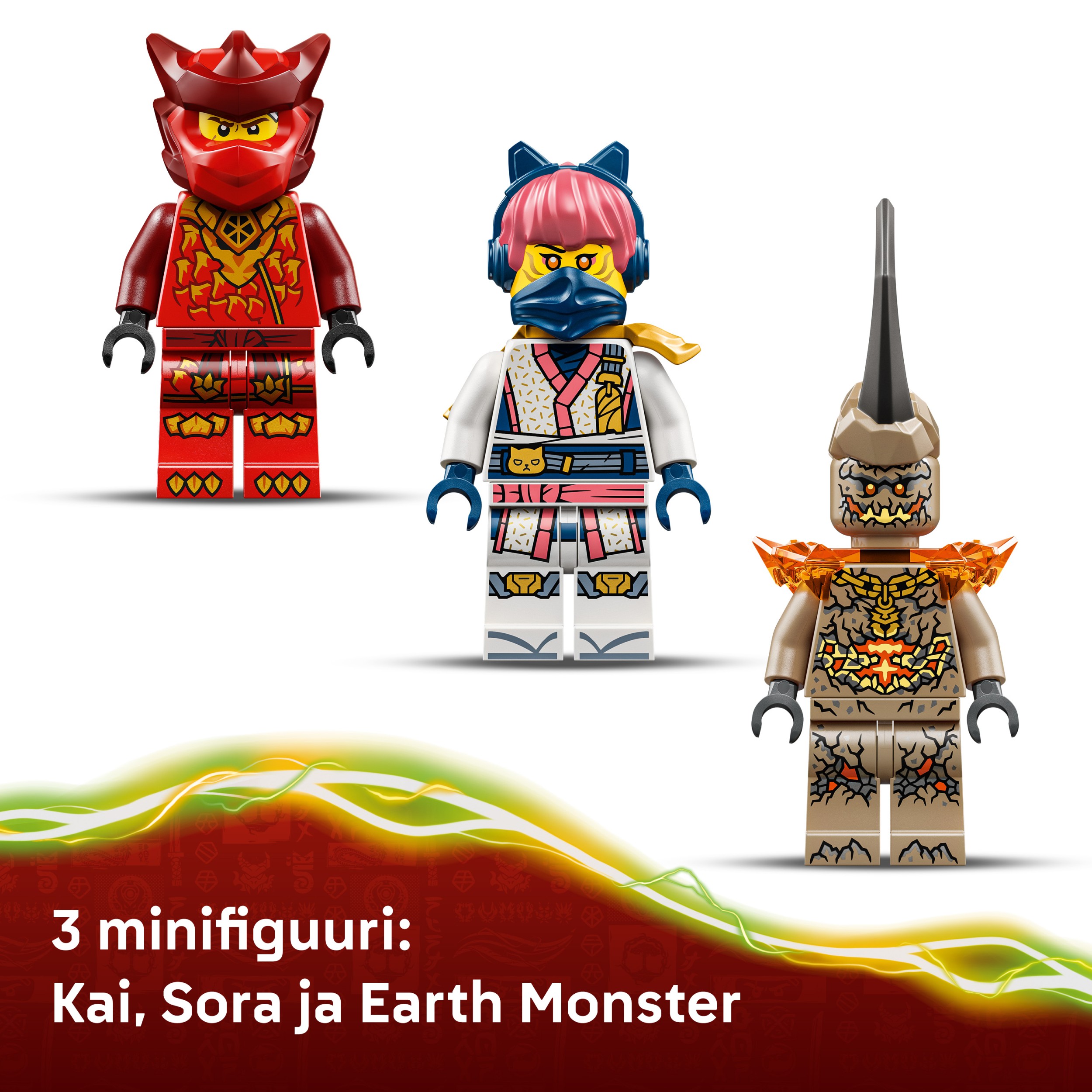 - Kolm NINJAGO® minifiguuri – Selle ninjamänguasjaga on kaasas Kai, Sora ja kurikuulus Maakoletis, et fännid saaksid mängida põnevaid hea ja kurja lahinguid