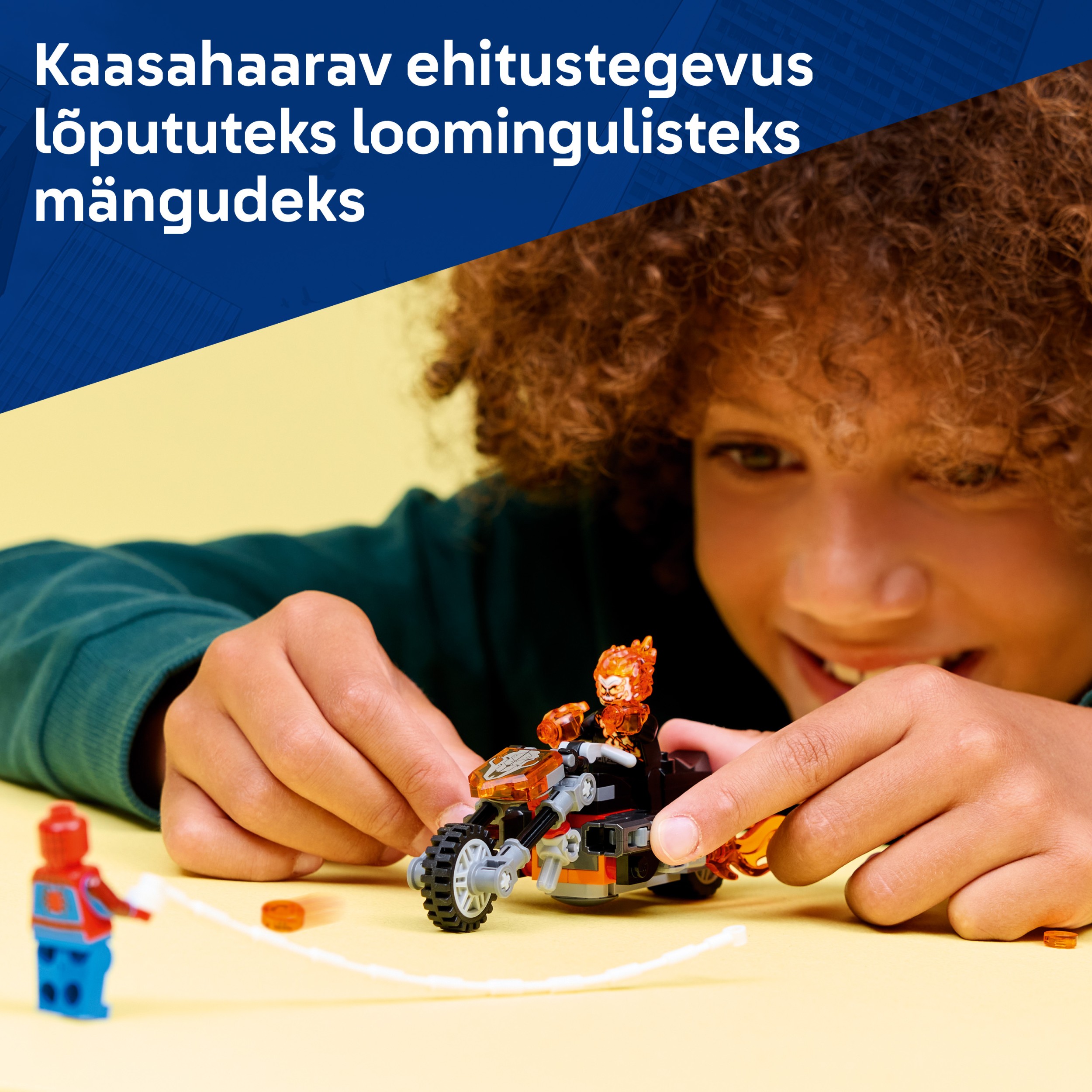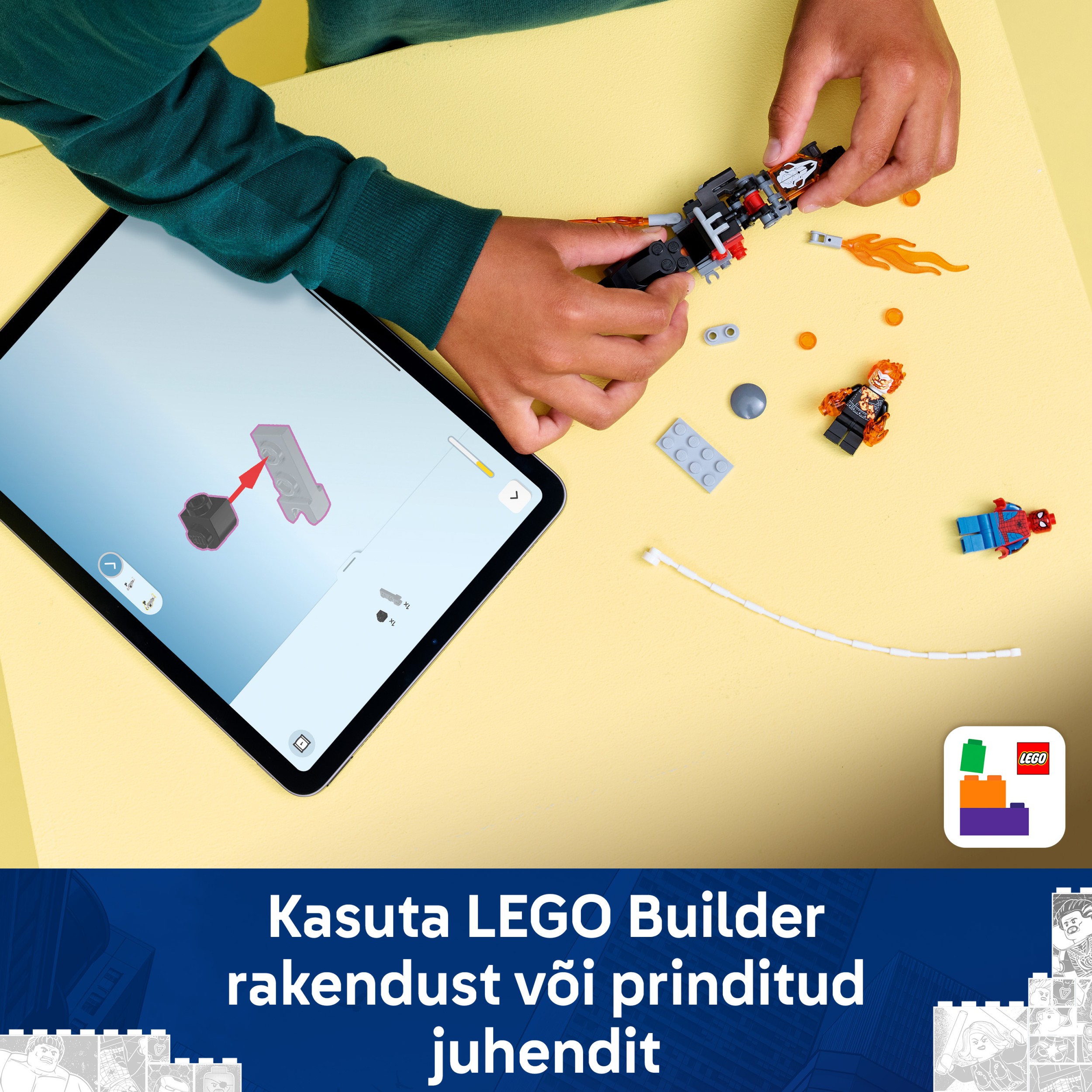 • 2 LEGO® ǀ Marveli minifiguuri – võrgukangelane Spider-Man ja leegitsev luukere Ghost Rider innustavad laste loovmängu