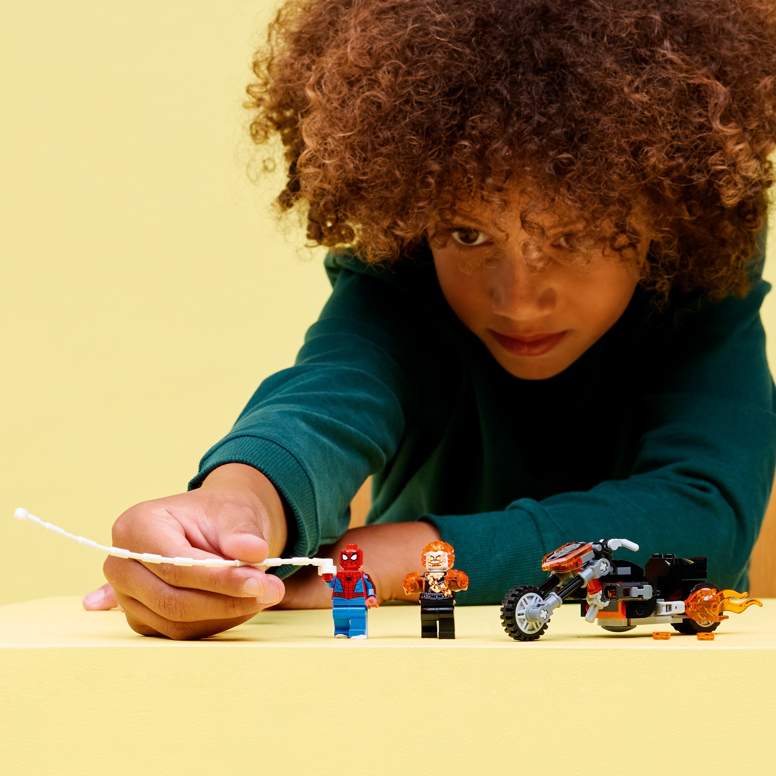 Ghost Rideri minifiguuri kujutatakse luukerena, mille kätest ja peast väljuvad leegid. Tema kuulsal mootorrattal on kaks leegitsevat summutitoru ja kaks sisseehitatud nupsukahurit. Spider-Mani minifiguuri võrgunöör kinnitub mootorratta külge, pakkudes lõputult rollimänguvõimalusi, kui tegelased võitlevad võimsal ja selle kõrval. See ehituskomplekt on suurepärane kingiidee noorte superkangelaste, LEGO ehitajate ja kogutavate Spider-Mani kaupade fännide sünnipäevadeks. Rakendusega LEGO Builder saavad lapsed ehitada enesekindlalt – suumida, pöörata 3D-s ja jälgida oma edenemist lihtsalt järgitavate digitaalsete juhiste abil. Ehituskomplektis on 72 osa.