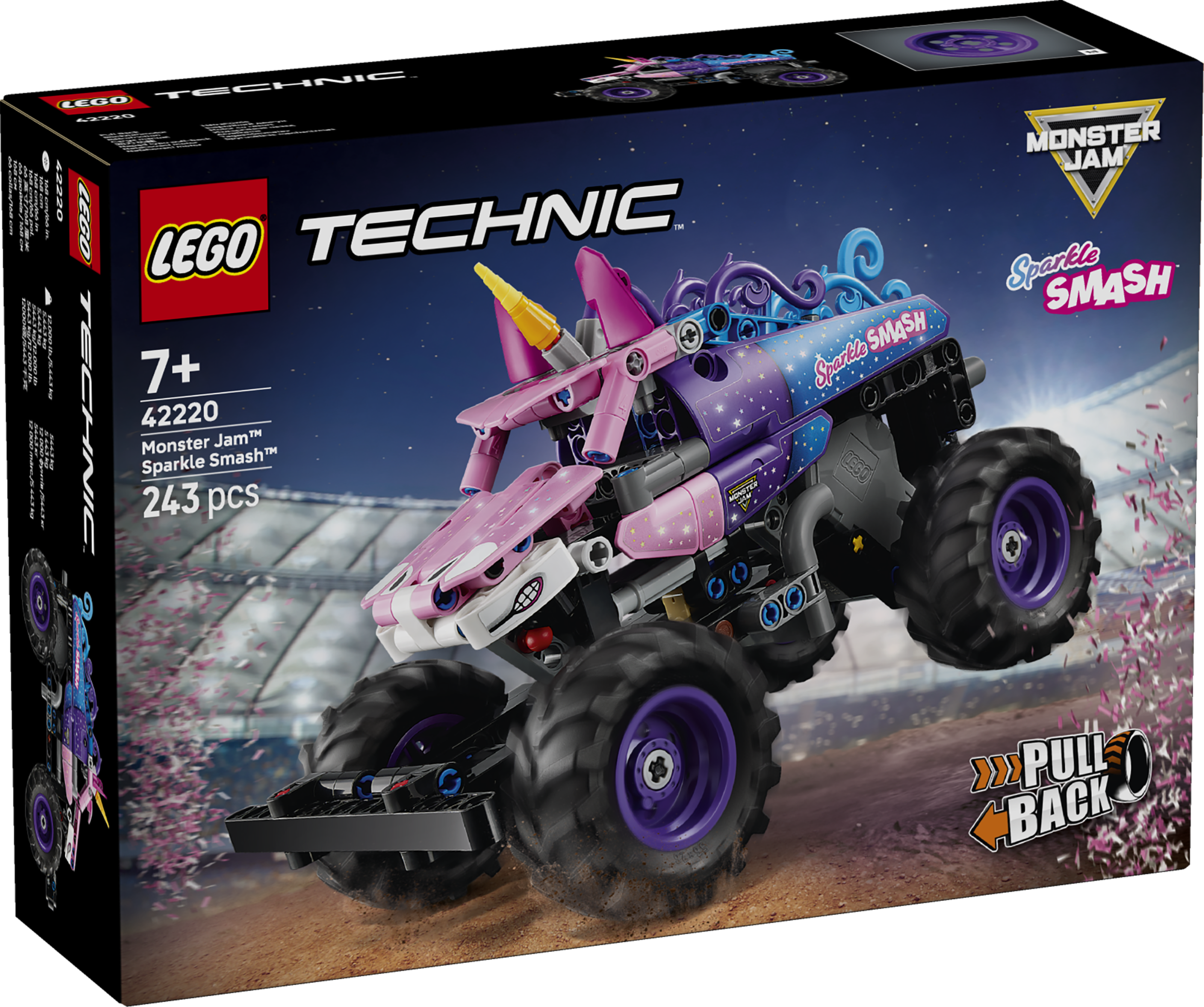 - MONSTER JAM™-i ehitusmänguasi – LEGO® Technic Monster Jam Sparkle Smash™-i tagasitõmmatav veoauto (42220) pakub tundideks mänguvõimalusi alates 7-aastastele poistele, tüdrukutele ja lastele, kes naudivad monsterautosid ja ükssarvikumänguasju