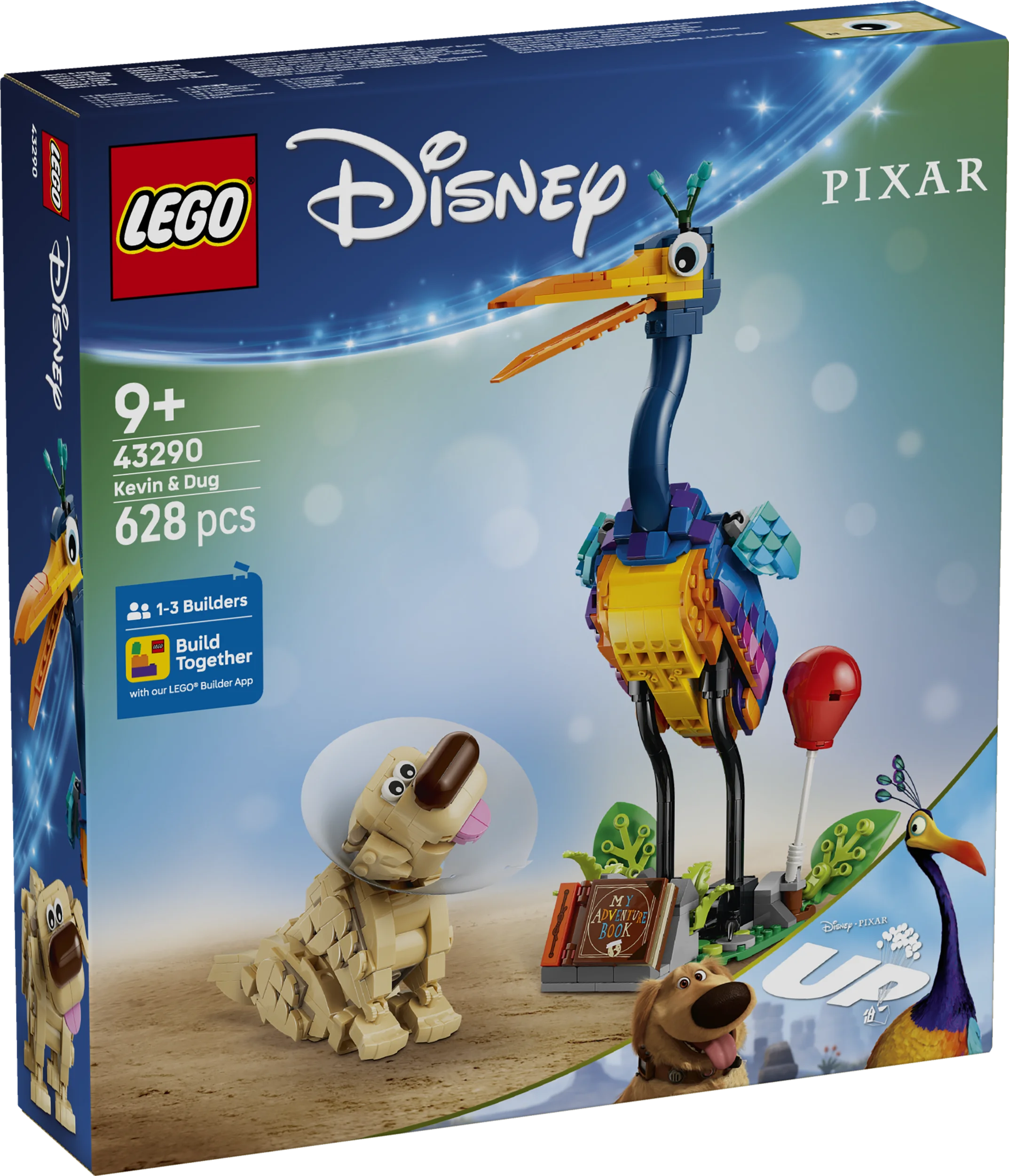 Seikkailut odottavat yli 9-vuotiaita lapsia tämän LEGO® ǀ Disney ja Pixar Kevin ja Dogi (43290) rakennussetin parissa. Up – Kohti korkeuksia ‑elokuvan inspiroima rakennelma sisältää Kevin-linnun ja Dogi-koiran eläinhahmot nyt ensimmäistä kertaa ikinä palikoista rakennettavassa LEGO ǀ Disney ja Pixar lelusetissä. Mukana on myös jalusta, jossa on liikuteltavia lehtiä ja tilaa seikkailukirjalle, punaiselle ilmapallolle, hassulle kaulurille, Dogin tutulle kaulapannalle ja muille tarvikkeille. Hahmot innostavat mielikuvitusleikkeihin, mutta ne voi laittaa myös koristeeksi hyllylle tai pöydälle.