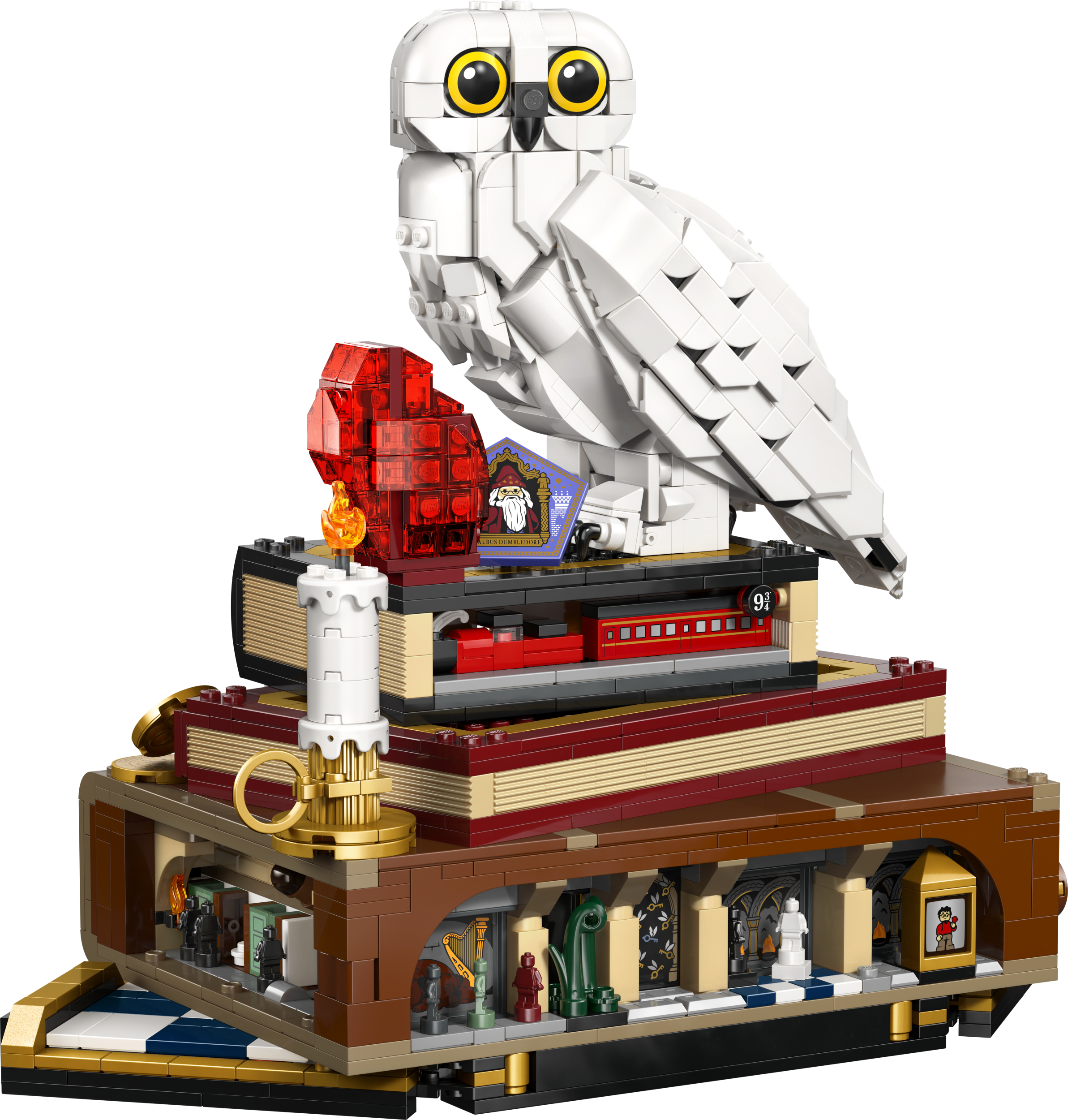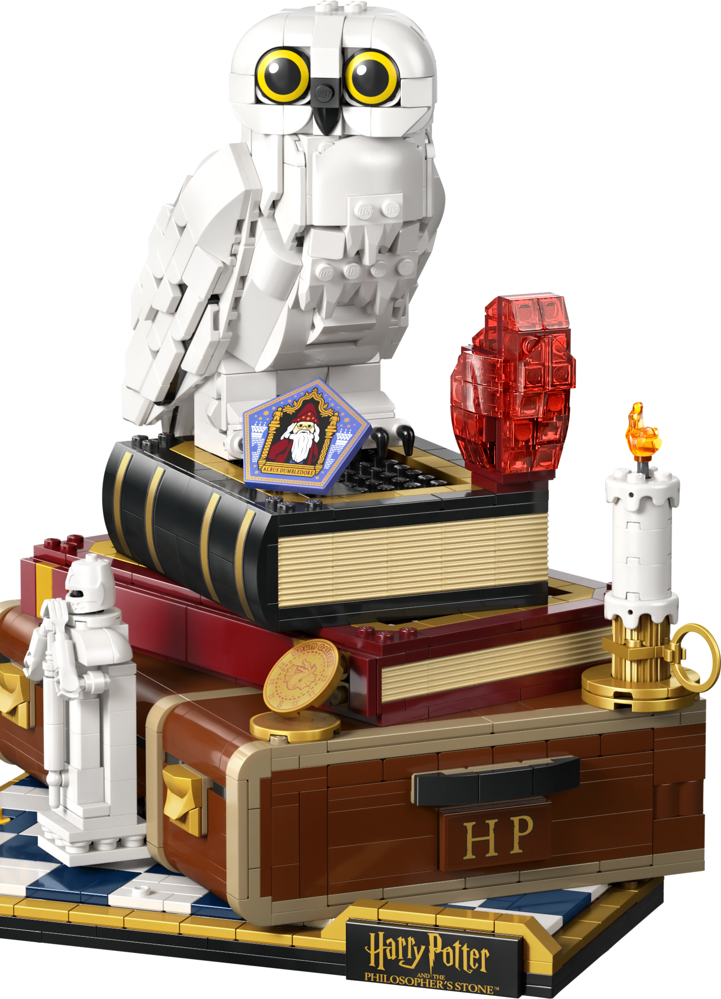 Rakenna siivet supussa istuva LEGO Hedwig™ tunturipöllöhahmo ja aseta se esille viisasten kiven viereen Harry Potterin kirstun päälle. Lisää sommitelmaan 3 LEGO Harry Potter minihahmoa – Harry Potter, Hermione Granger™ ja ™ Ron Weasley™ – sekä suklaasammakkokortti, velhoshakkilauta ja muita esineitä.