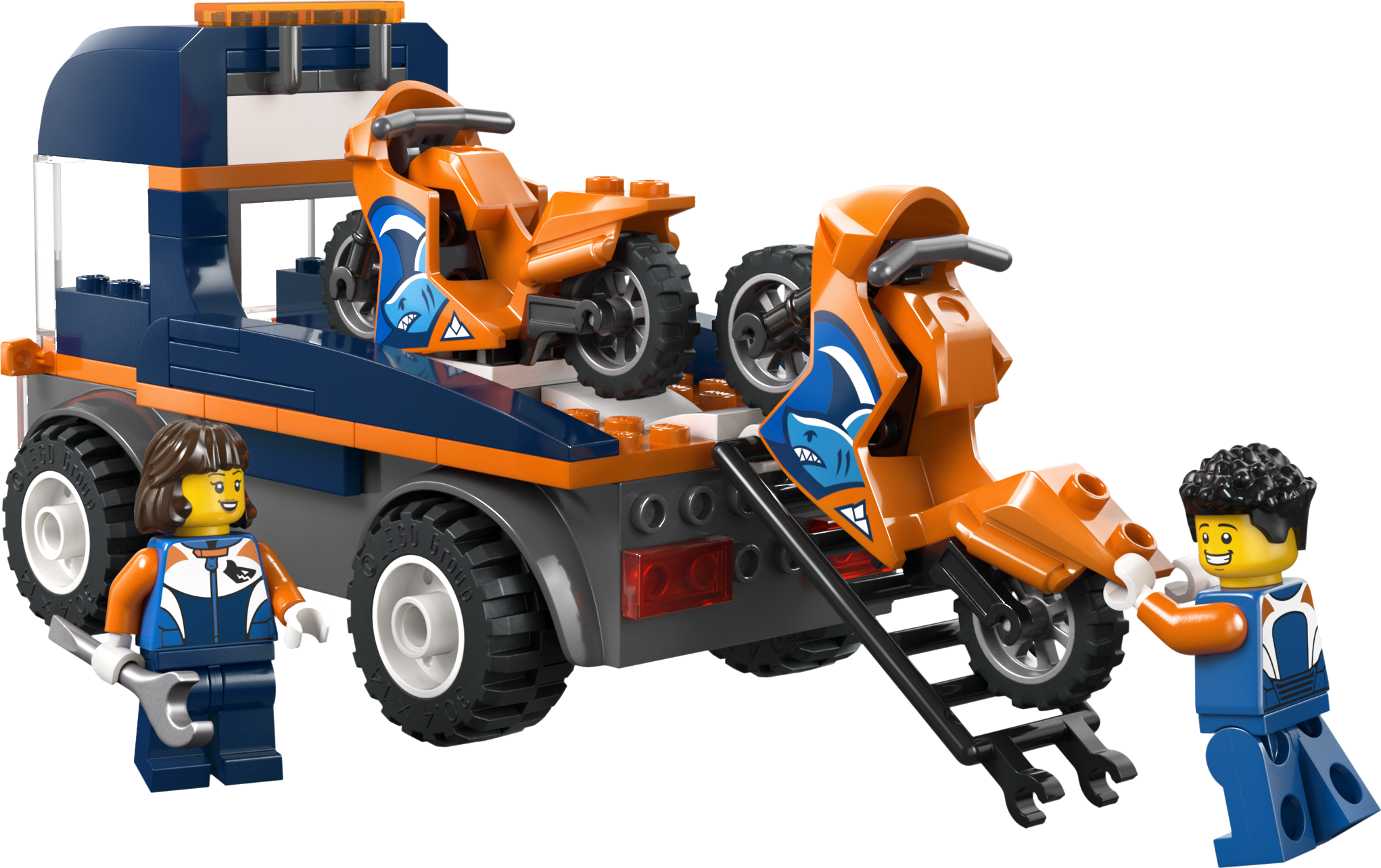- PAKKAUKSEN SISÄLTÖ – Lapset voivat rakentaa setin osista lava-auton, 2 moottoripyörälelua ja 2 kuljettajan minihahmoa, jotka innostavat mielikuvitusleikkeihin ja tarinankerrontaan