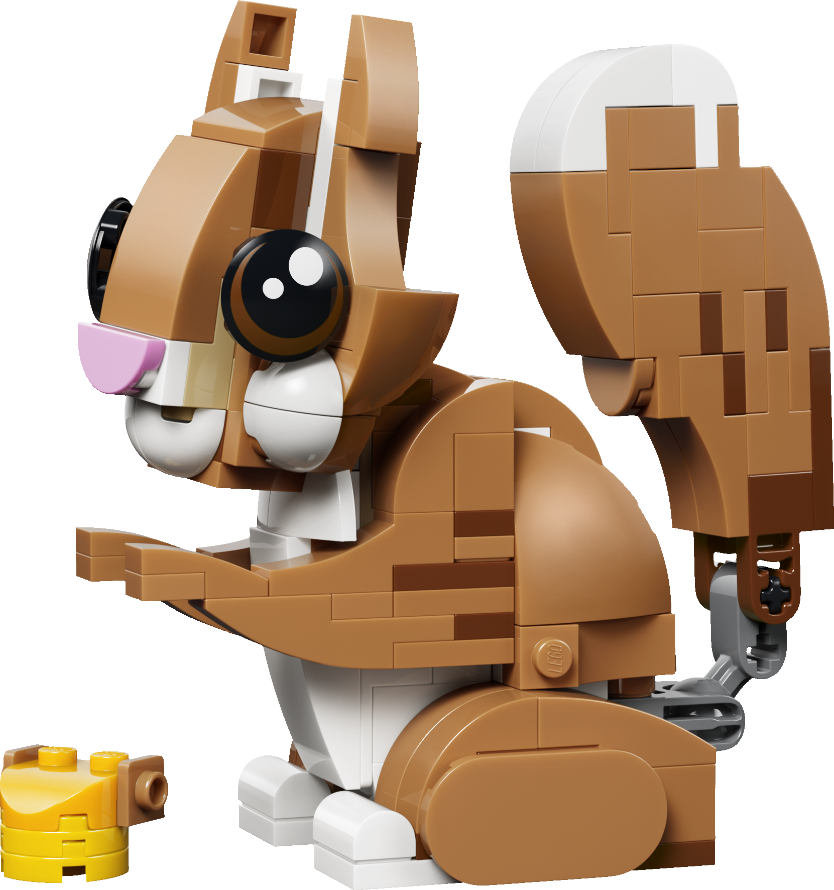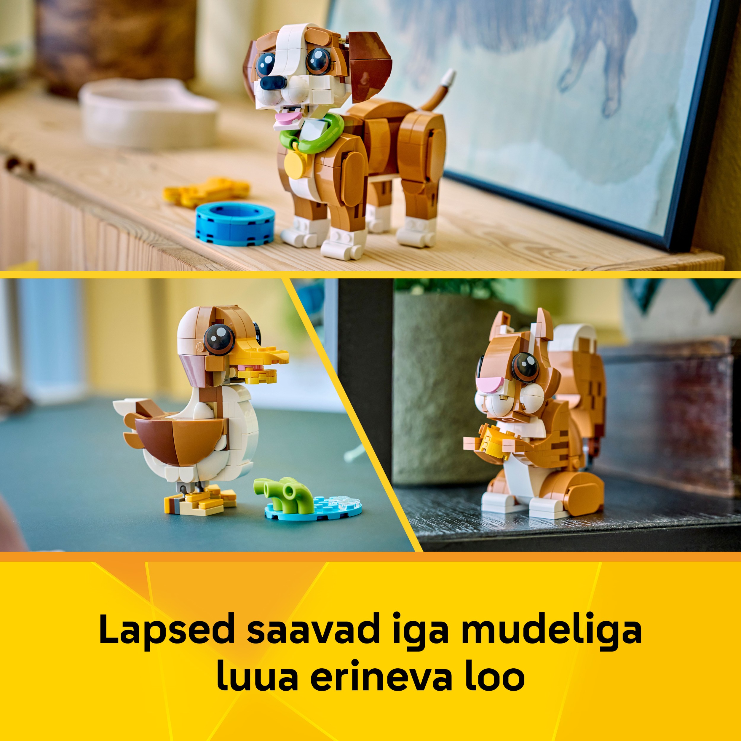 - ERI ASENTOIHIN ASETELTAVIA LEGO® ELÄIMIÄ – Koiran pään, suun, hännän, korvat, kulmakarvat ja jalat voi asettaa eri asentoihin, oravan päätä ja häntää voi liikutella, ja ankan päätä voi kääntää