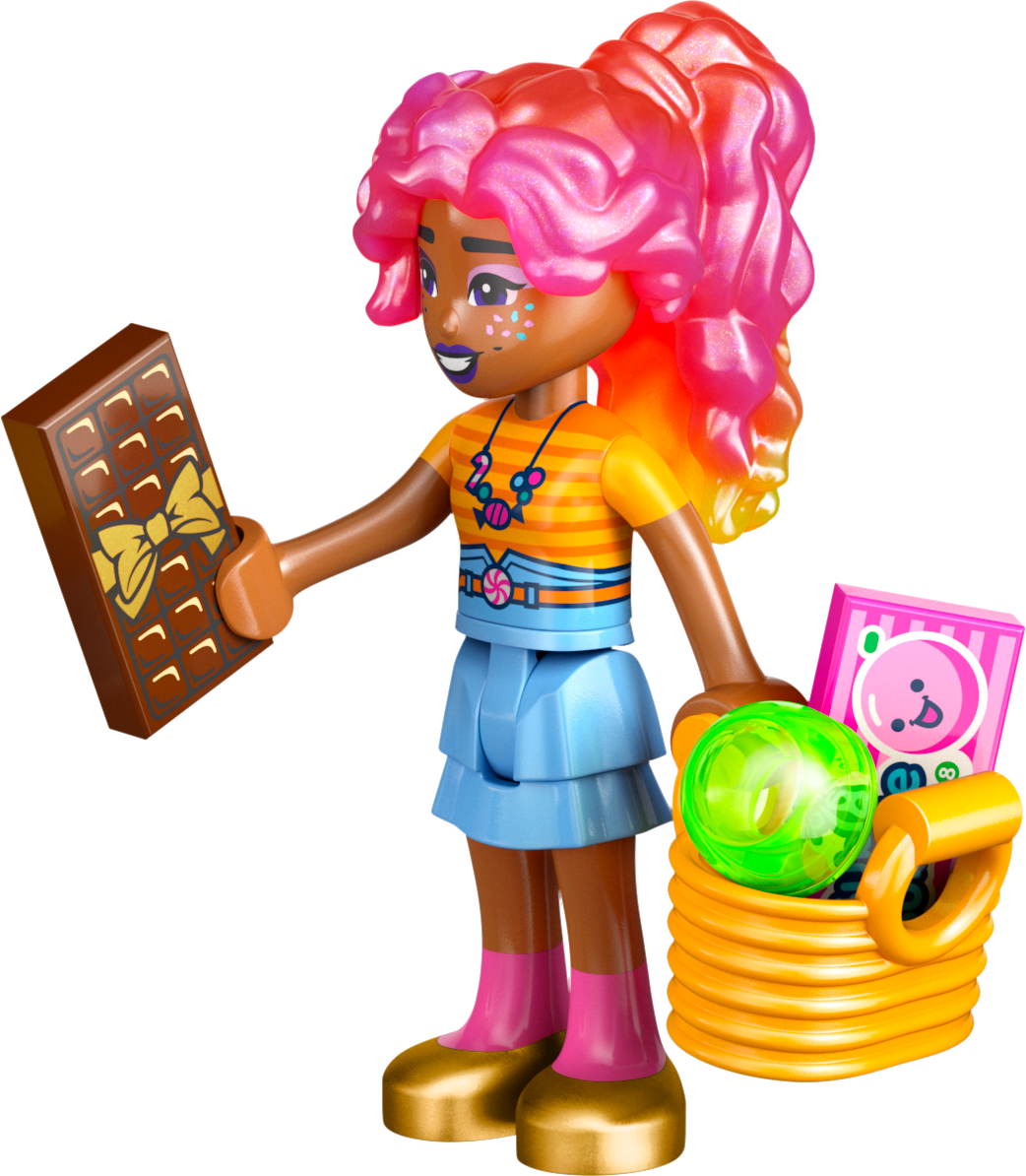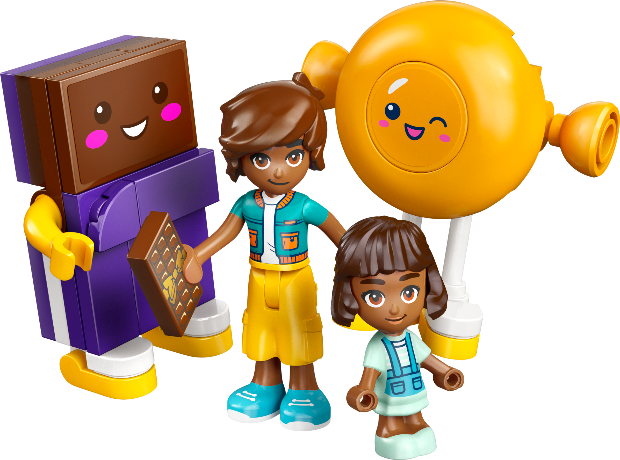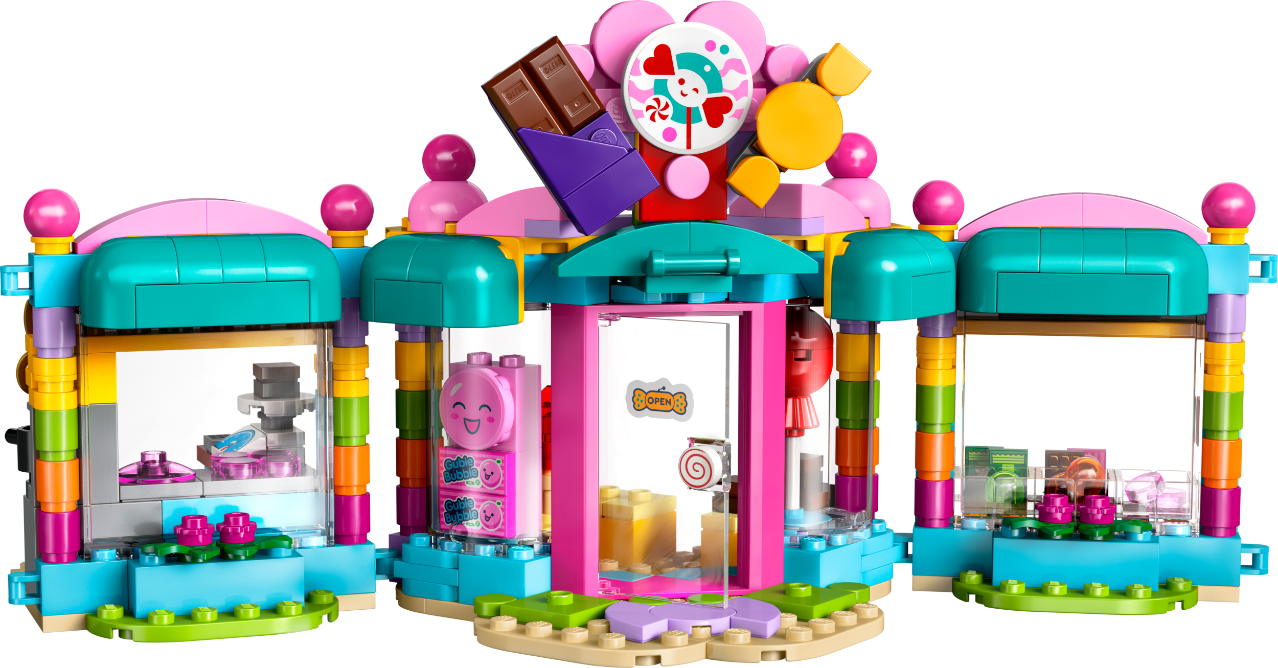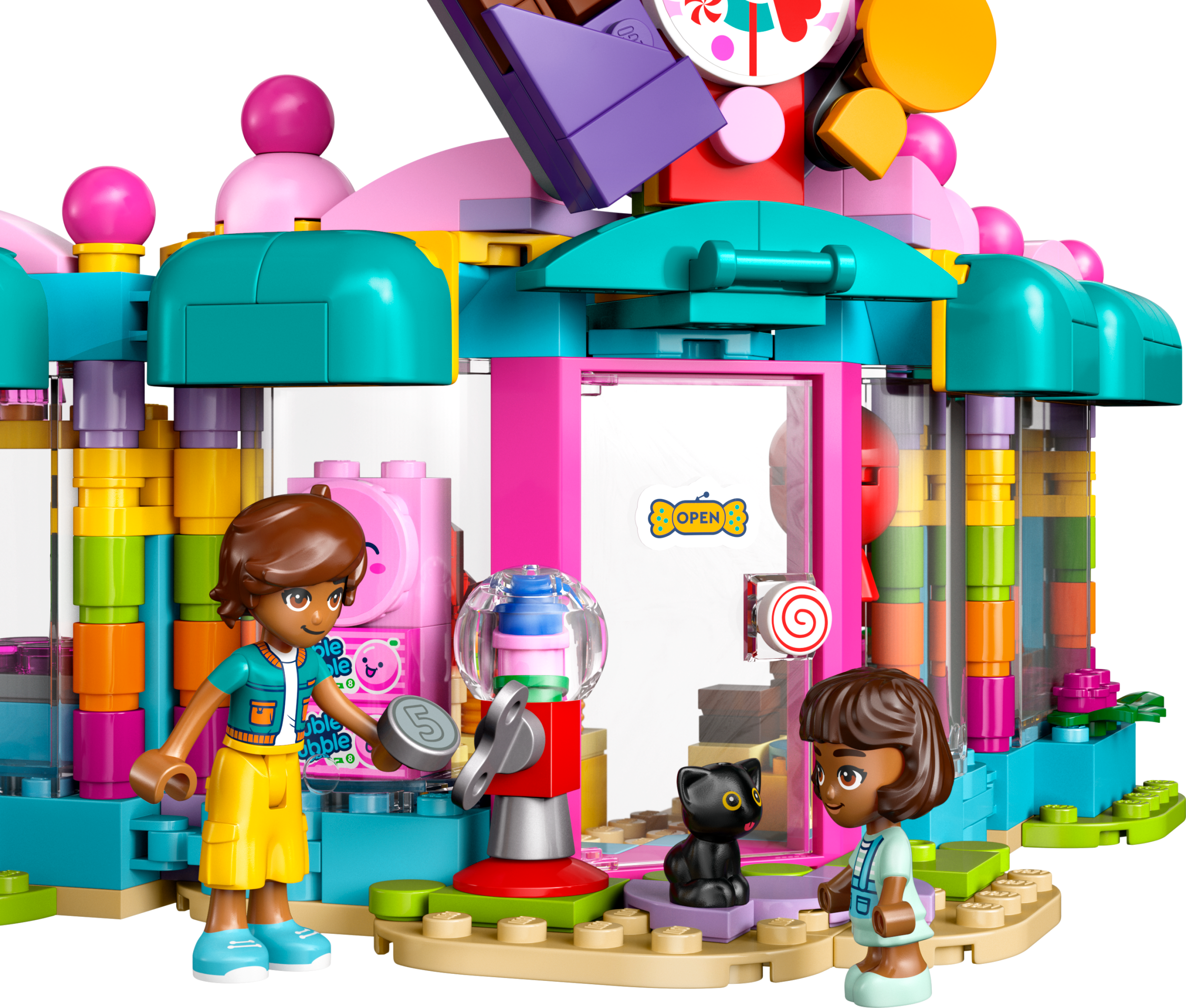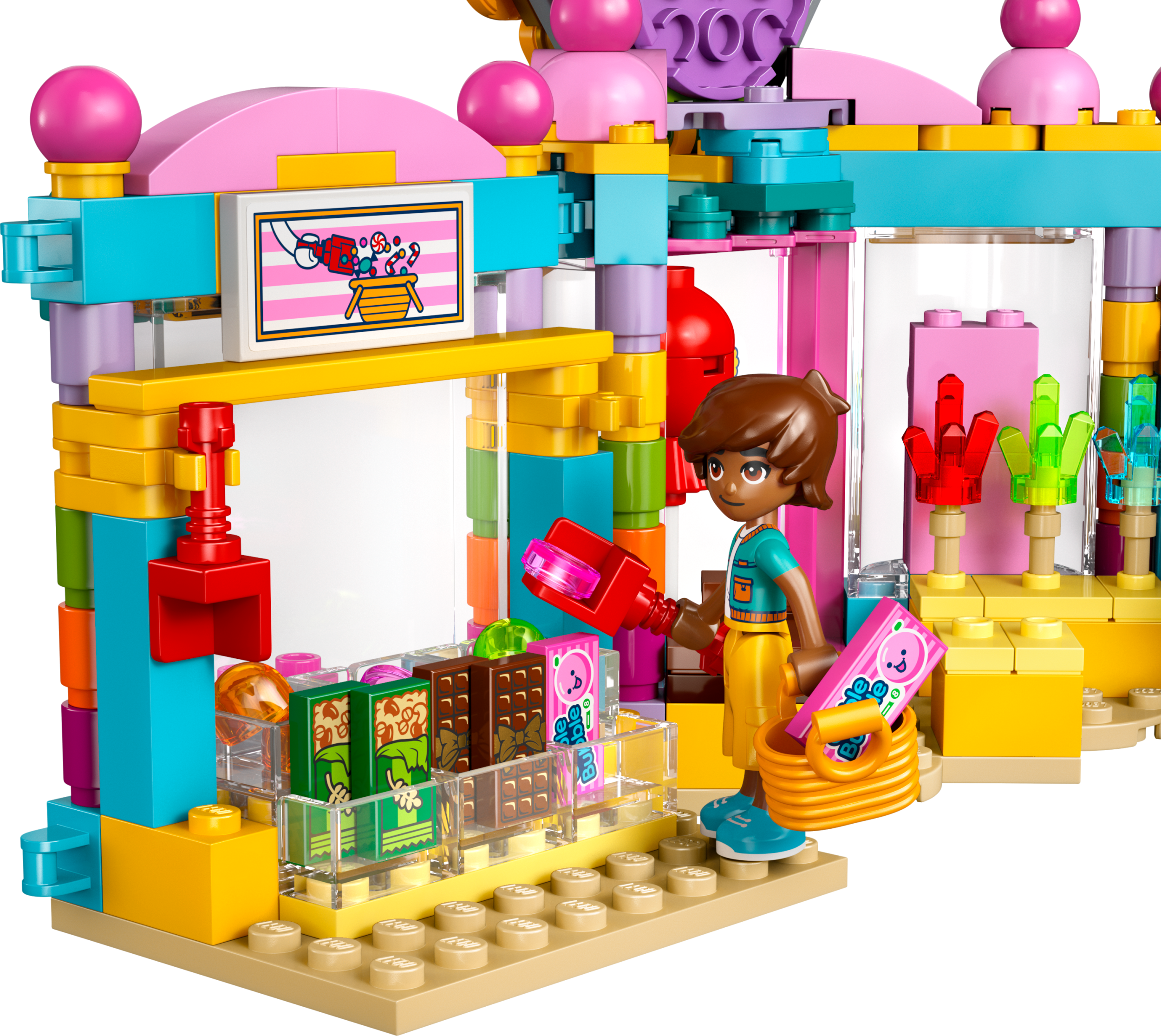 Lasten sosiaaliset taidot karttuvat tämän setin inspiroimien leikkien lomassa. Nuoret rakentajat voivat leikkiä kauppaleikkejä ja keksiä tarinoita Leon ja tämän Alba-pikkusiskon kanssa. Setti on täynnä karkkikauppaan liittyviä yksityiskohtia, joihin lukeutuvat irtokarkkivalikoima, jättikokoinen tikkari, purkkapalloautomaatti ja kassakone. Rakennelmassa on myös makeisten valmistuspiste aineksineen, saksineen ja astioineen. Tutustu myös kaupan kahteen söpöön maskottiin – suklaapatukkaan ja käärepaperikarkkiin.