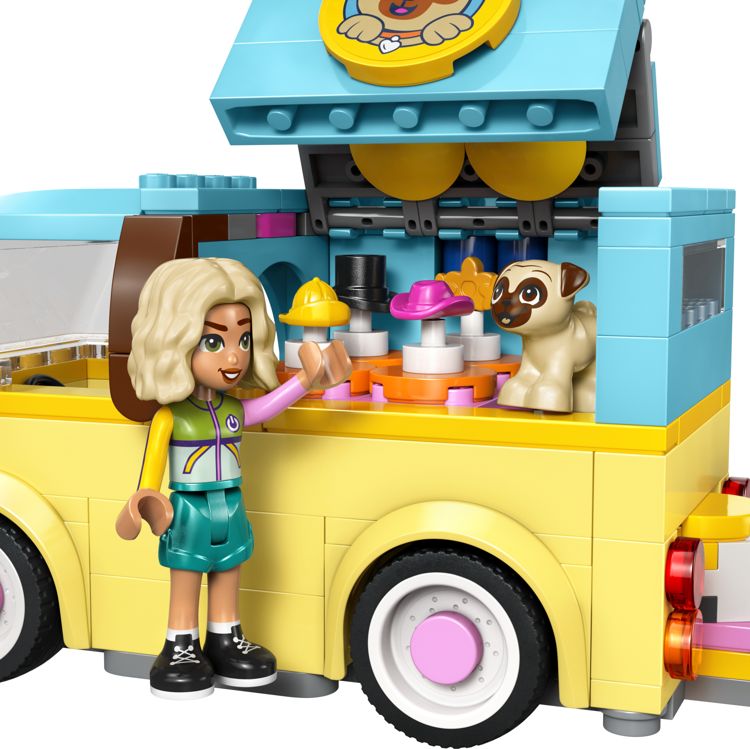 - MOPSIN NÄKÖINEN PAKETTIAUTO – Toimitukset onnistuvat häntä hauskasti heiluen hurmaavalla LEGO® Friends Lemmikkitarvikeautolla (42678), jossa on koiranpennun kasvot ja heiluva häntä