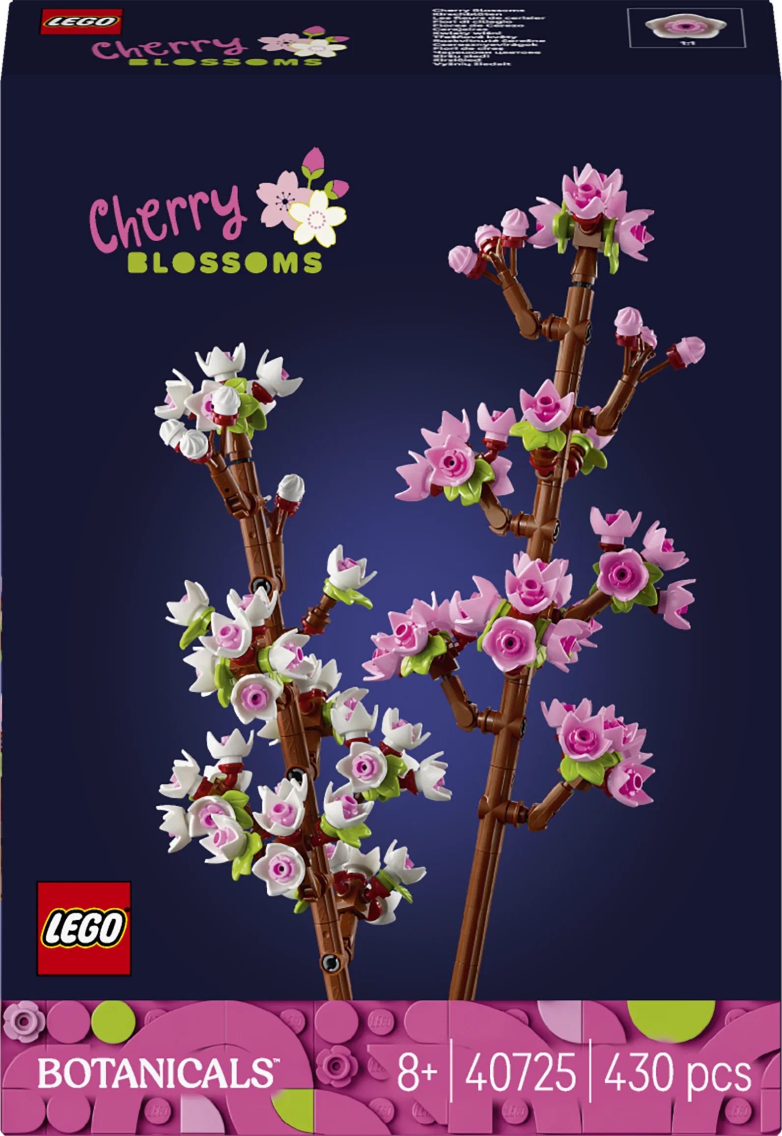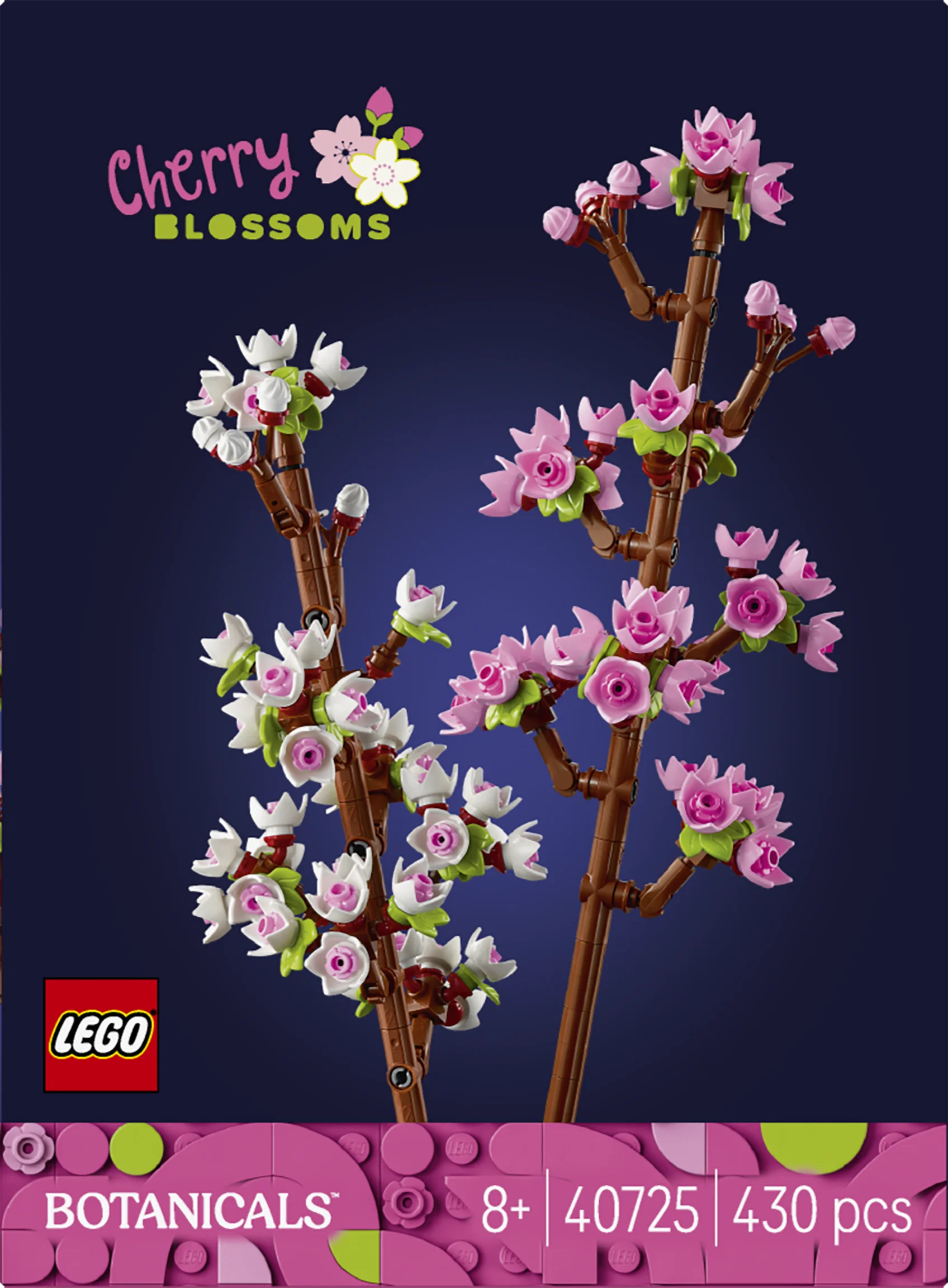- Keväisiä värisävyjä – LEGO® setistä rakentuu 2 kirsikkapuun oksaa, joissa on vaaleanpunaisia ja valkoisia kukkia