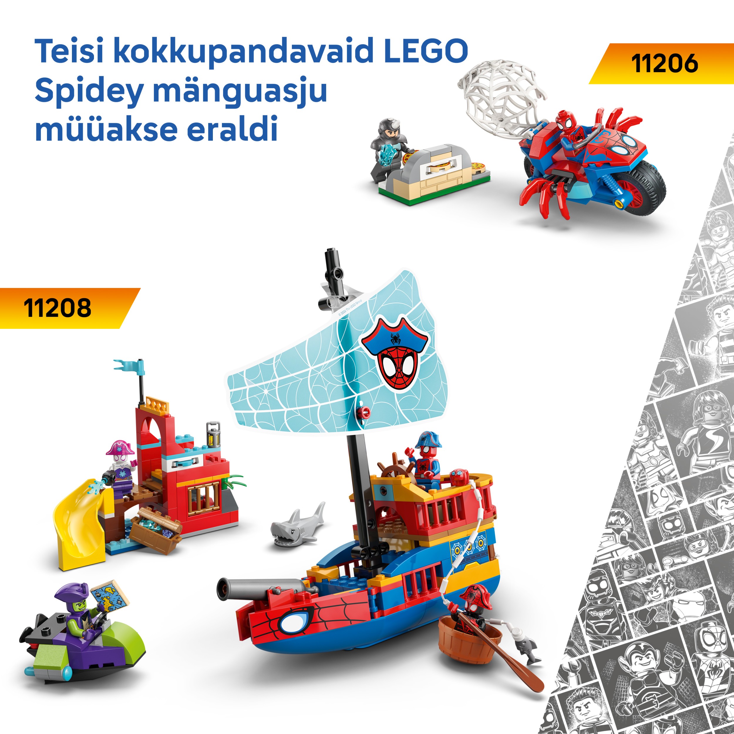 Spidey ja vedenalaiset menopelit ‑leikkisetin (11207) parissa yli 4-vuotiaat pojat, tytöt ja LEGO® ǀ Marvel fanit voivat suunnata mielikuvitusseikkailuihin. Luovuutta kehittävä rakennussetti sisältää Spideyn, Ghost-Spiderin ja tohtori Mustekalan minihahmot sekä 3 sukellusvenettä.