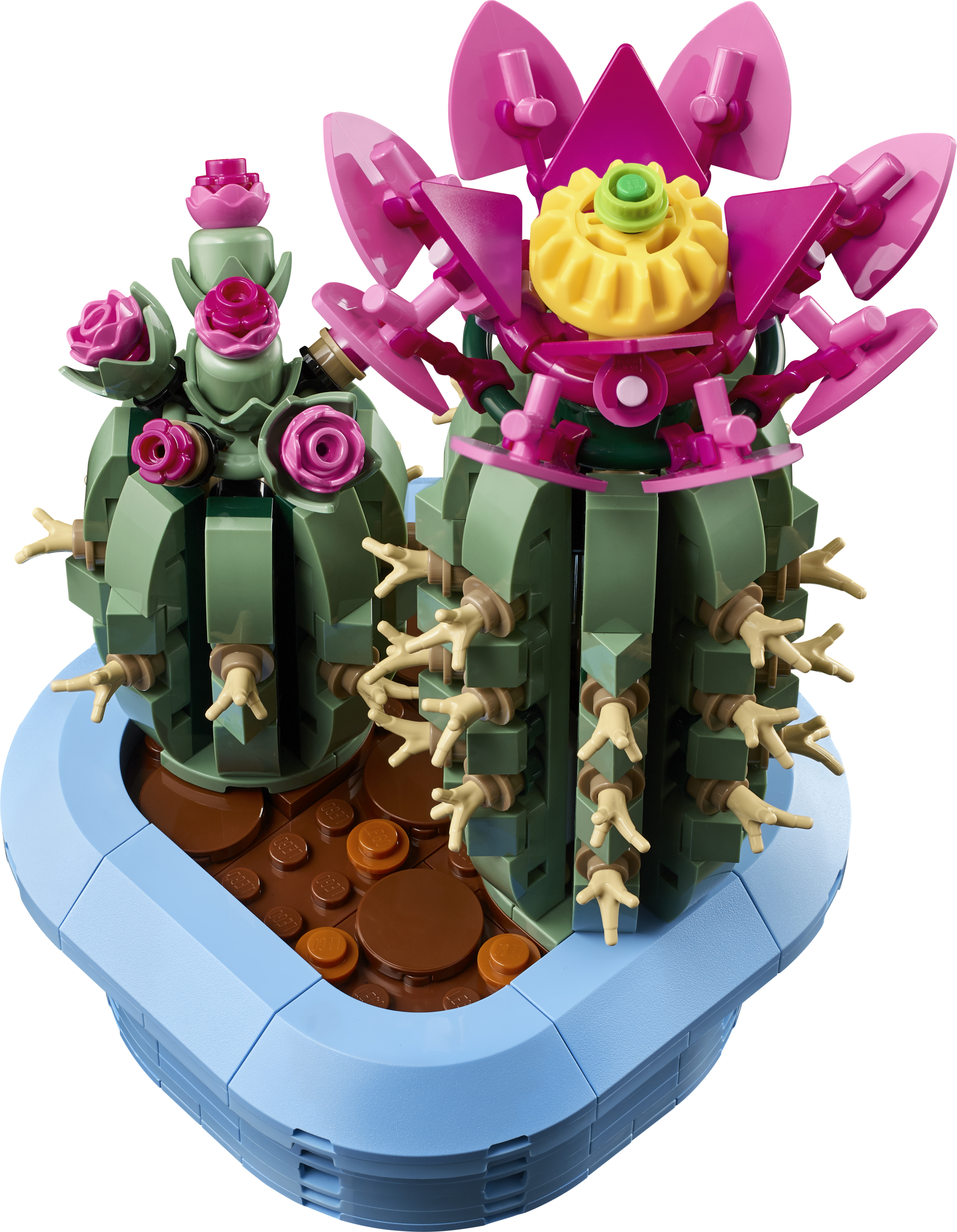 Bērni vēros, kā zeļ viņu radošums, būvējot divus kaktusu modeļus. Lielākais LEGO kaktuss ir pilnā plaukumā, un tā galā ir rozā zieds ar dzeltenu centru, savukārt mazākajam LEGO kaktusam ir rozā ziedi dažādās plaukšanas stadijās. Kaktusi ir autentiski zaļā krāsā un abus vari demonstrēt pasteļzilā puķu podā, tāpēc brīdī, kad tie uzbūvēti, bērniem tos ir viegli izlikt apskatei guļamistabā vai kā mājas dekoru.