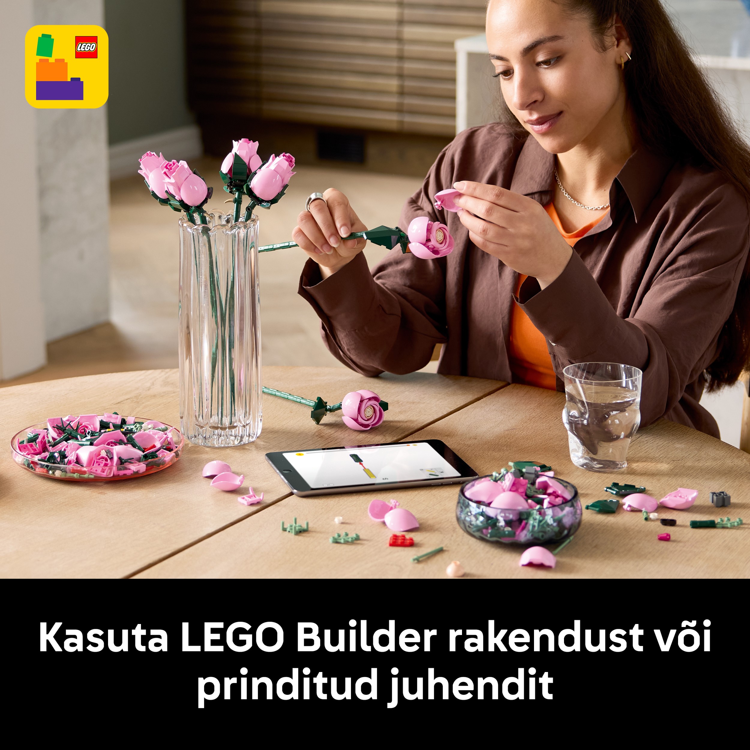 Izbaudi saistošu projektu, rūpīgi darinot LEGO buķeti, kurā ir 12 rozā rozes dažādos to dzīves posmos – atklāj četras rozes pilnā plaukumā, četras plaukstošas rozes un četrus rožu pumpurus. Rozes ir krāsotas rozā gradientu toņos papildu autentiskumam, un buķetē ir arī četri burvīgi ģipsenes zariņi ar nelieliem baltiem ziediem. Šis komplekts ir ideāls būvēšanai vienatnē vai grupā, un tas ietver trīs būvēšanas instrukciju komplektus, kas ļauj saliedēties ar draugiem un ģimeni, un pēc tam ar gandarījumu izlikt rozes apskatei kā ziedošu dekoru.