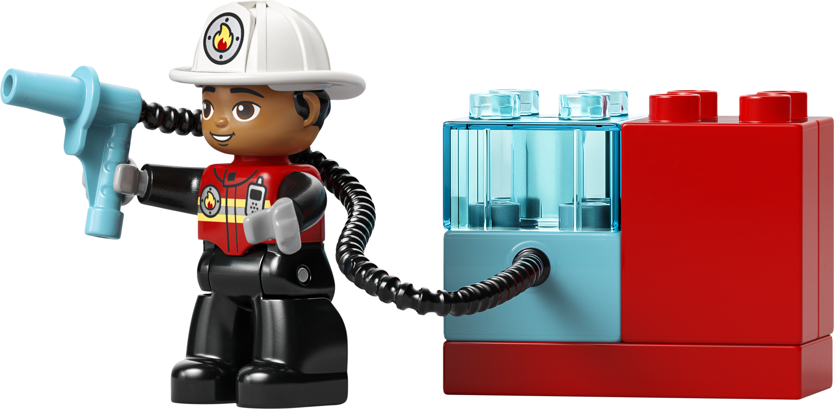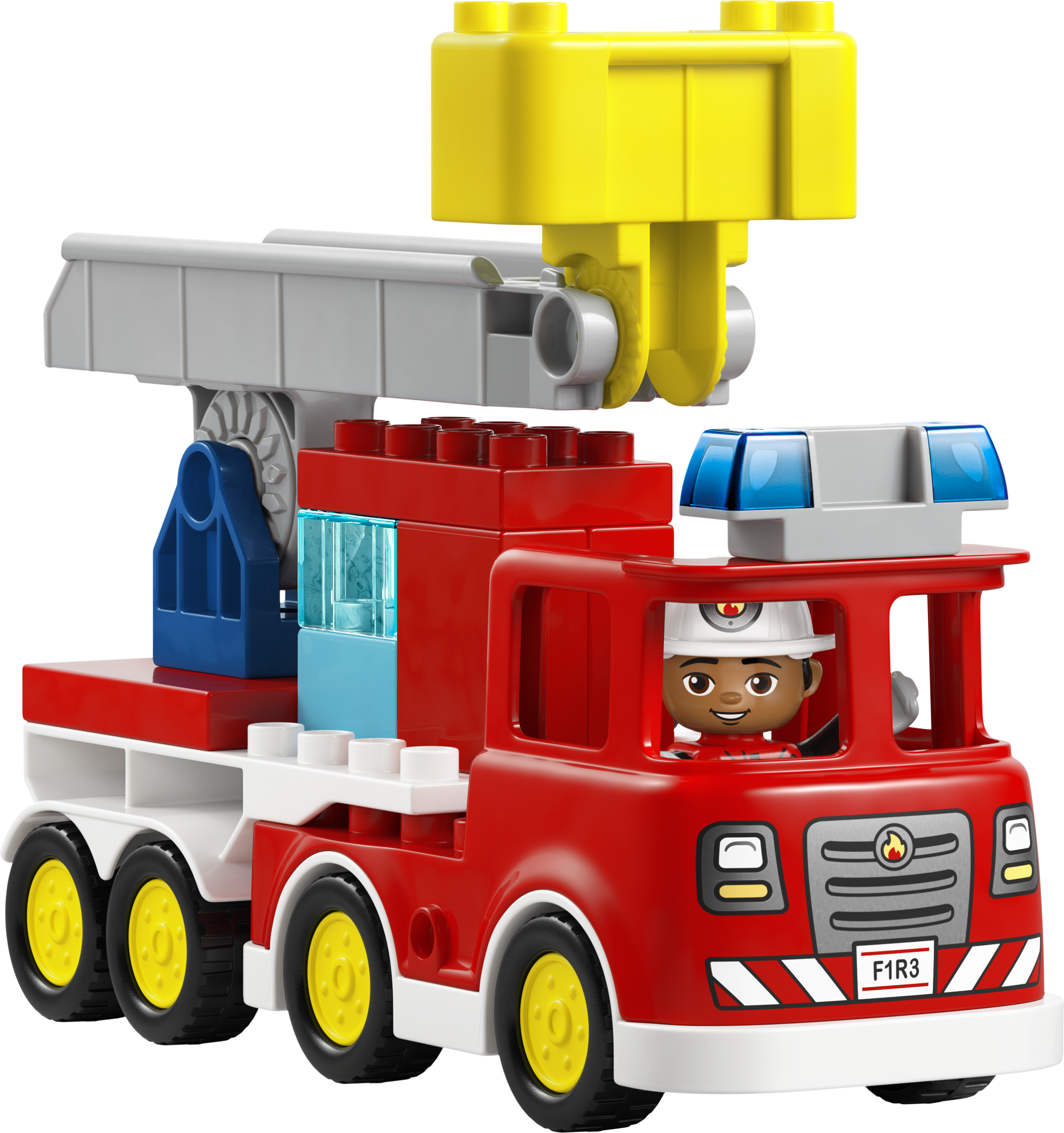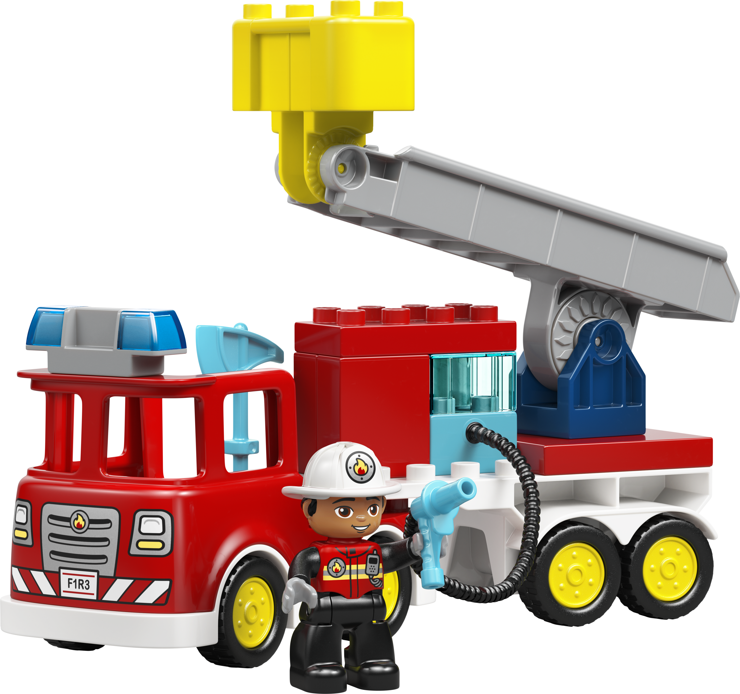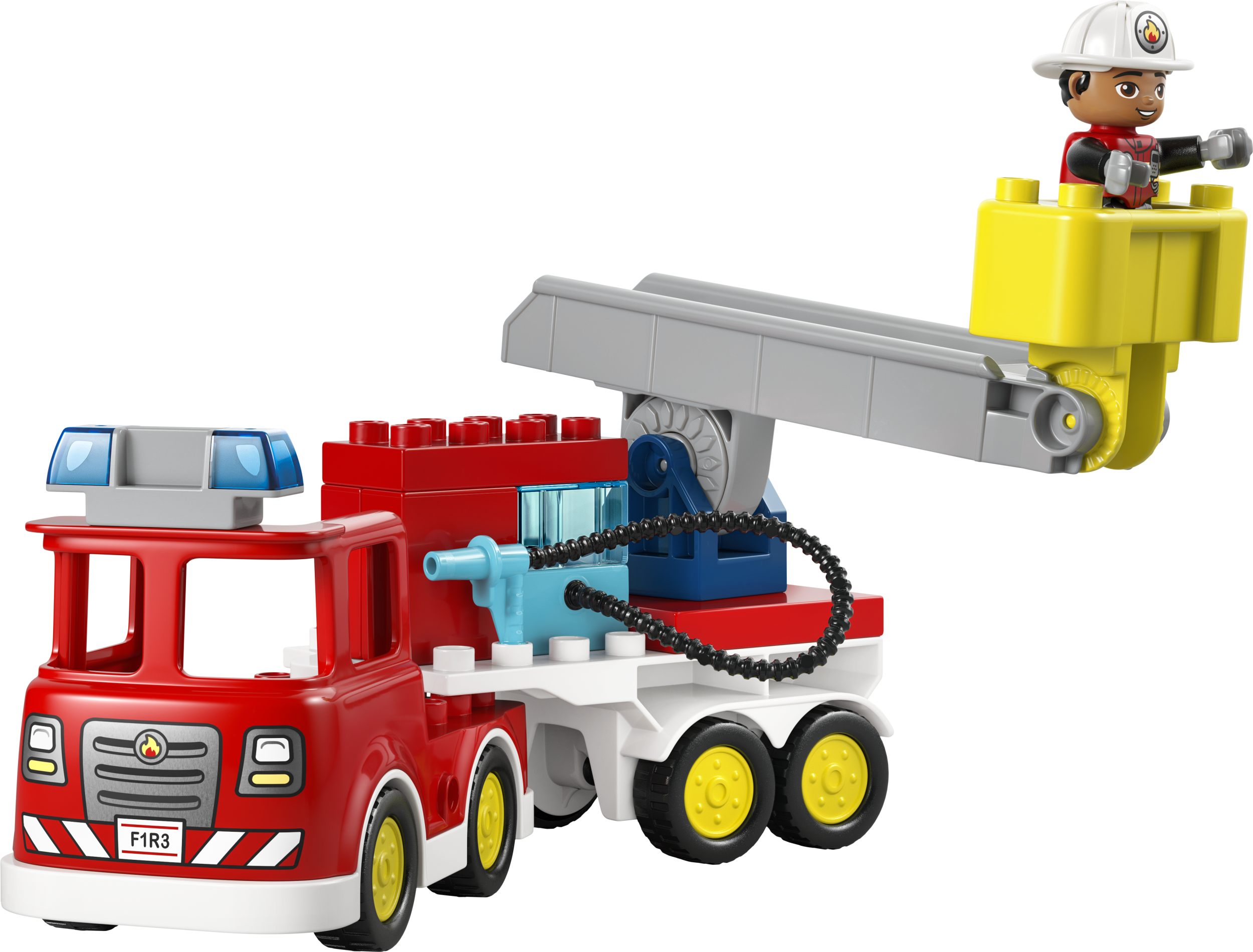 LEGO DUPLO ugunsdzēsēju auto modelītim ir daudz aizraujošu funkciju, kas veicinās radošus stāstus par glābšanu. Tam ir arī kāpnes un caurspīdīgs LEGO DUPLO klucītis kā ūdens tvertne. Topošie ugunsdzēsēji var izlikties, ka piestiprina šļūteni, lai nodzēstu liesmas. Mazuļi arī attīsta sīkās motorikas iemaņas, pārveidojot ugunsdzēsēju auto, padarot tā piekabi kustīgu, lai būtu vieglāk apbraukt stūrus. Komplektā ir 28 detaļas.