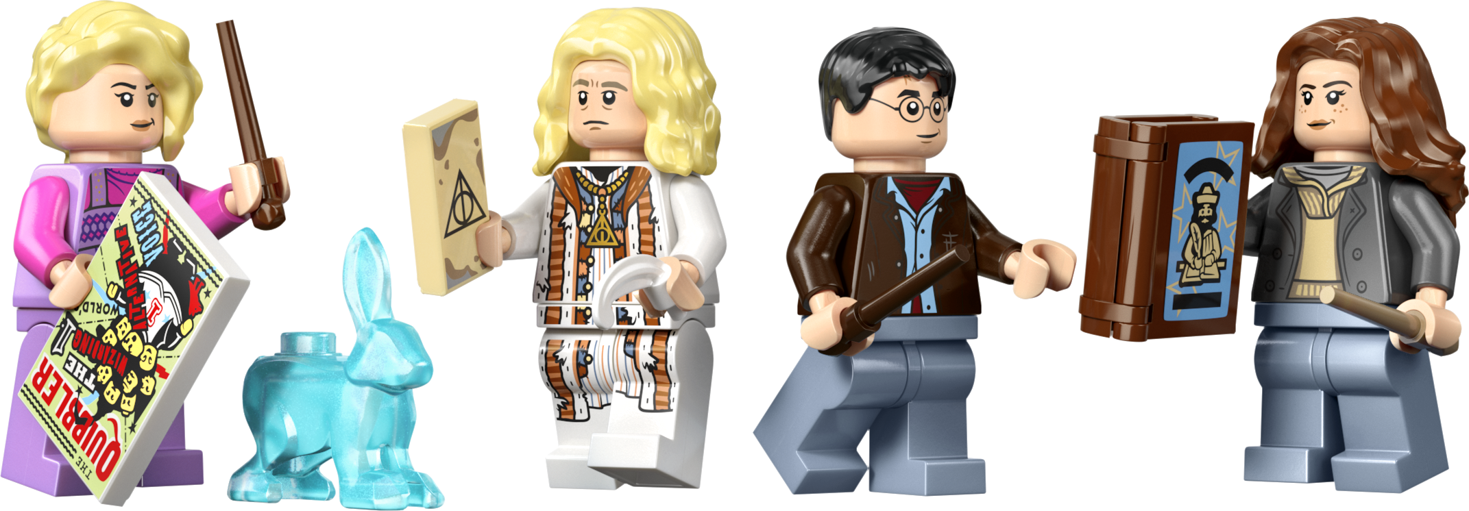 - 5 LEGO® HARRY POTTER™ MINIFIGŪRAS. Luna Mīlaba, Ksenofīlijs Mīlabs, Harijs Poters, Hermione Grendžera un nāvēdis, katrs ar zizli, kā arī 25. gadadienas piemiņlieta – Aizstāvis zaķis