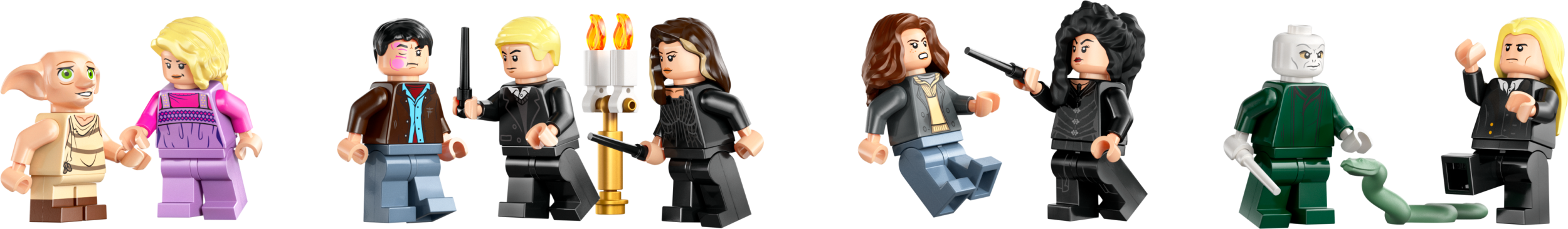 - 10 personāži. Harijs Poters, Narcisa Malfoja, Hermione Greindžere, Bellatrise Svešovska, Drako Malfojs, Lūcijs Malfojs, Luna Mīlaba, Lords Voldemorts un Dobijs, kā arī Nagīni rotaļu figūra