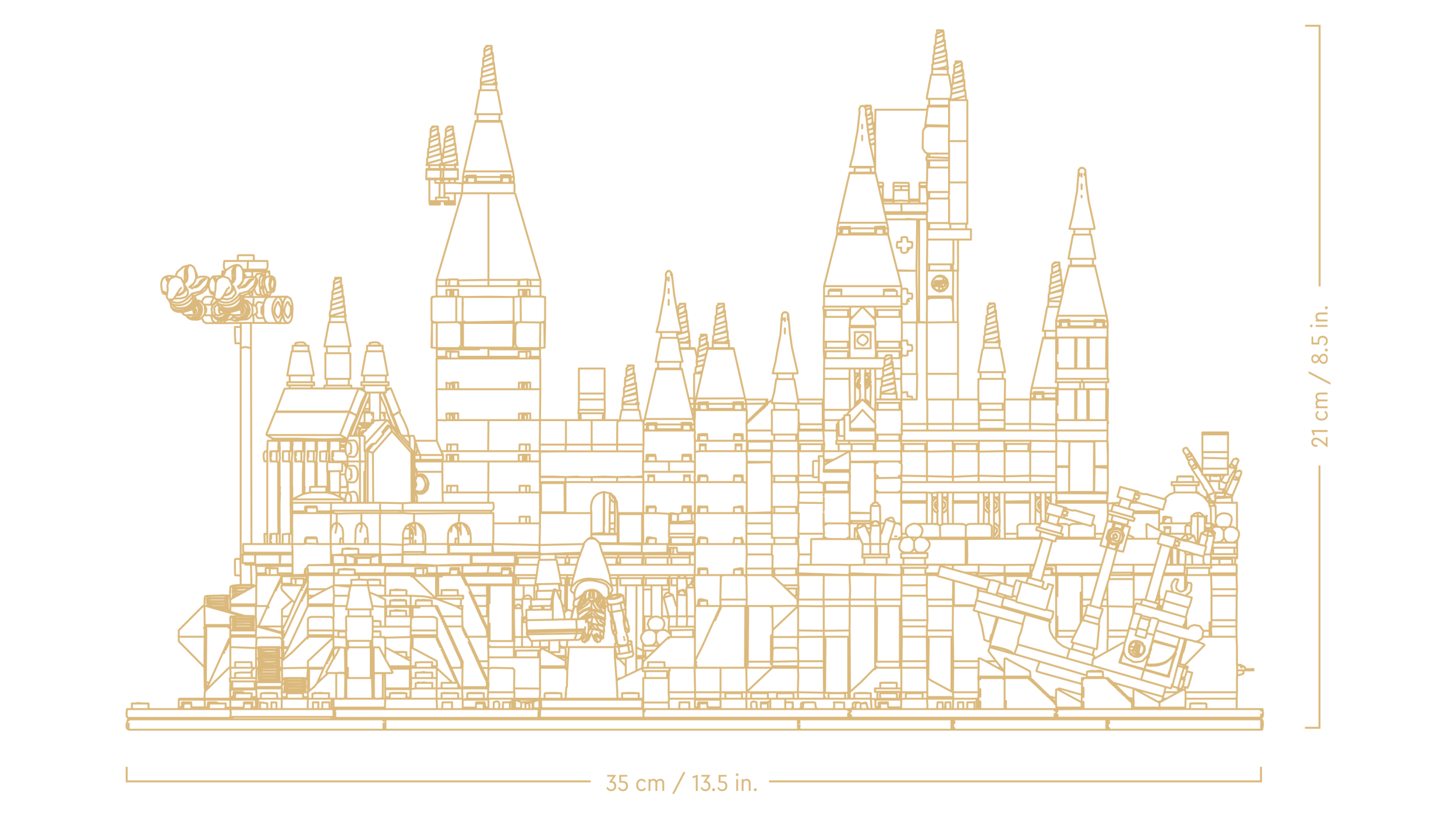 - Iekļauta skulptūras minifigūra. Novieto apzeltīto Cūkkārpas arhitekta skulptūru blakus nosaukuma plāksnītei “Hogwarts Castle” (“Cūkkārpas pils”) vai būvpamatnes stūrī, lai noformētu apskatei izliekamo ainu