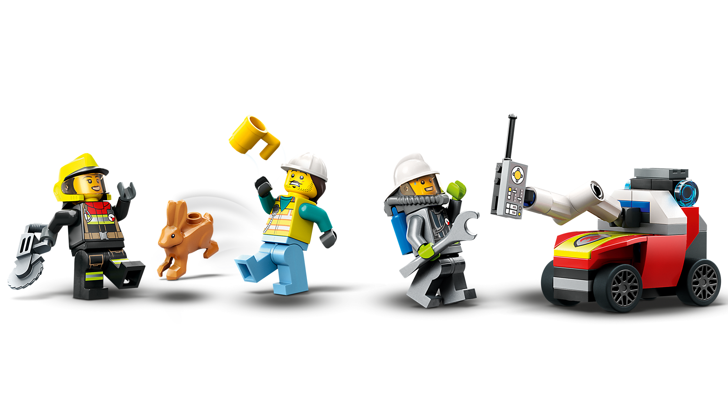 • Iekļauti LEGO® minifigūru piederumi. Šim ugunsdzēsēju rotaļu komplektam ir daudz interesantu piederumu iztēles bagātām rotaļām, tostarp radio, ugunsdzēsēju cirvis, ripzāģis, uzgriežņu atslēga un krūze