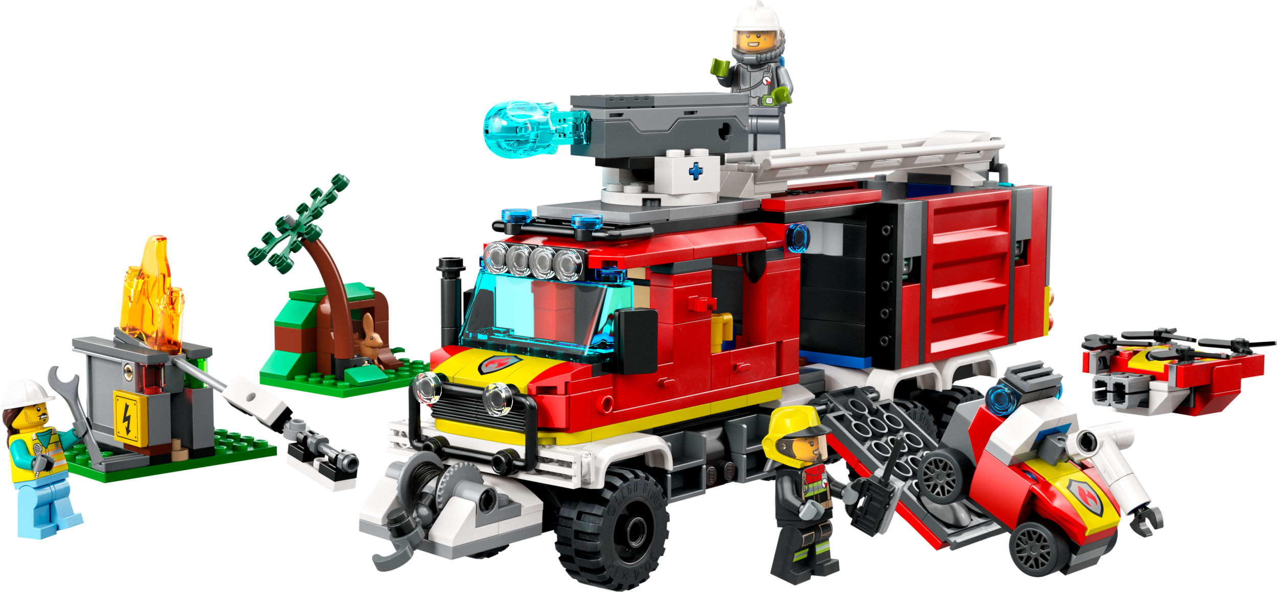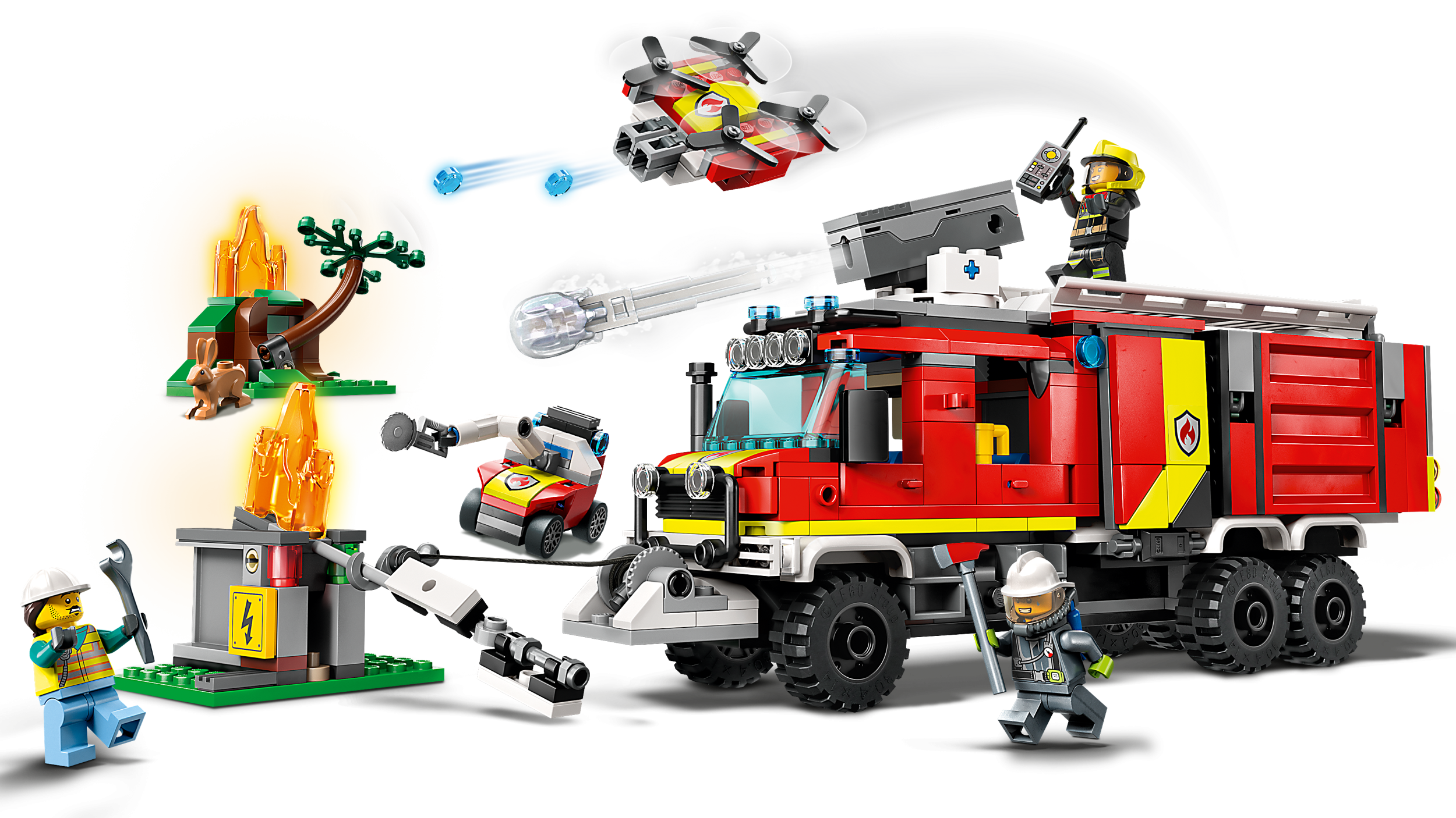 •  Kas ir kārbā? Viss bērniem nepieciešamais, lai uzbūvētu rotaļu ugunsdzēsēju transportlīdzekli ar uguns dronu, zemes dronu un komandcentru, kā arī pilsētas un meža uguns ainava, 3 minifigūras un truša figūra