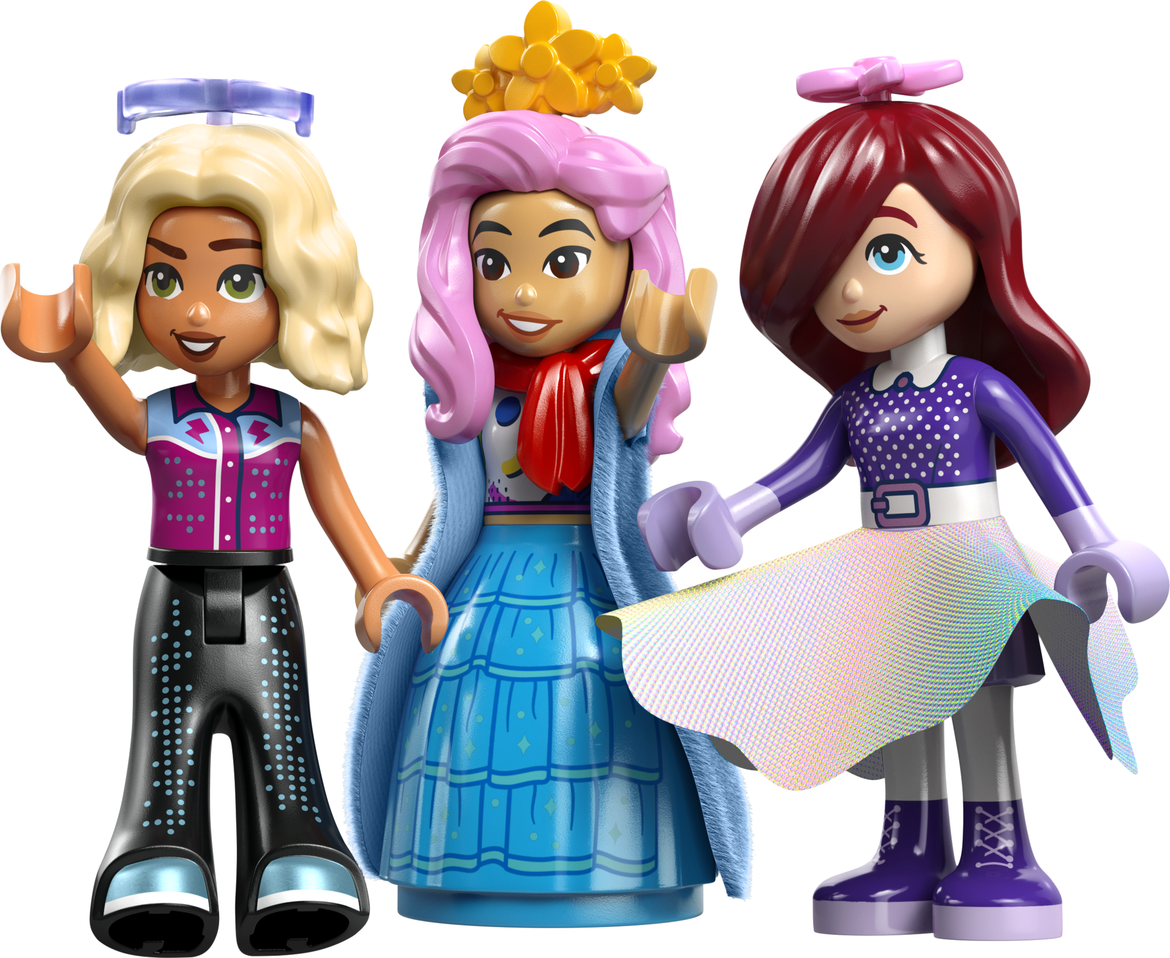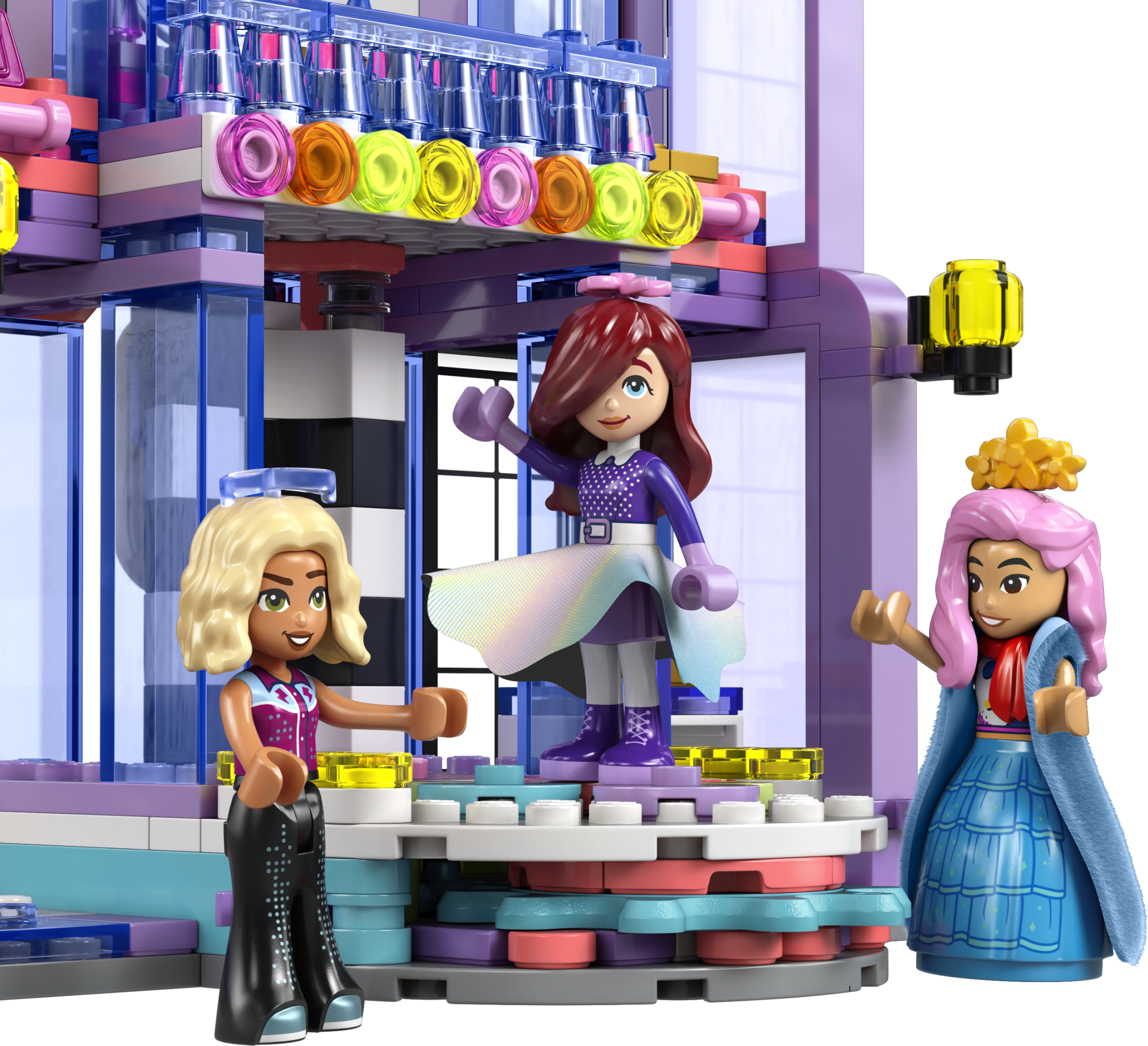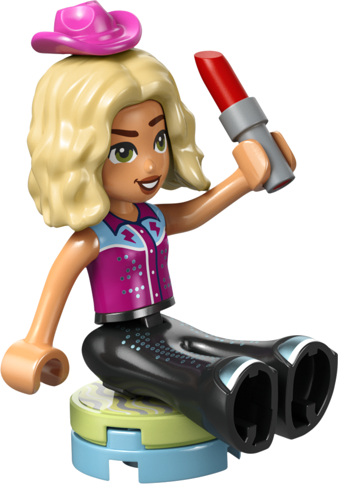 - 3 LEGO® FRIENDS PERSONĀŽI. Šajā modes un tērpu rotaļlietā ir 3 minilellītes – Peislija, Lianna un Nova –, kuras saģērbt pie spoguļa un tad novietot uz grozāmās platformas, lai parādītu tērpus