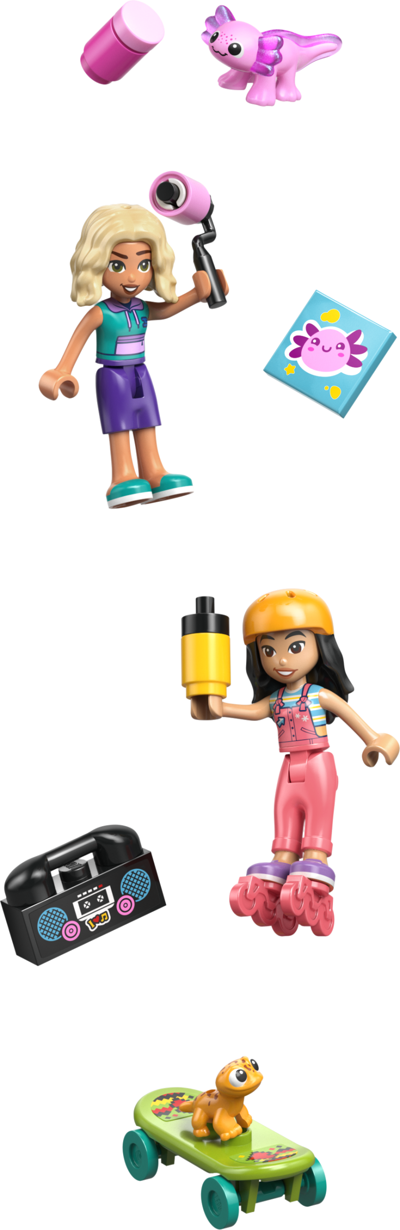 - 4 LEGO® FRIENDS PERSONĀŽI. Šajā rotaļlietā lomu spēlēm ir Liannas, Mišelas, Peislijas un Novas minifigūras, kā arī gekona un aksolotla rotaļu figūras, kam ir pašiem savi terāriji un barība
