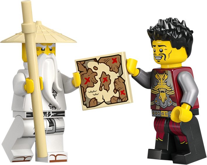 - 6 NINJAGO MINIFIGŪRAS. Šis nostalģiskais komplekts ietver tēlus no TV seriāla – Maya, Ray, Nya, Kalēju Kai, Meistaru Wu –, kā arī pašu pirmo reizi kolekcionējamu Zemes pavēlnieku