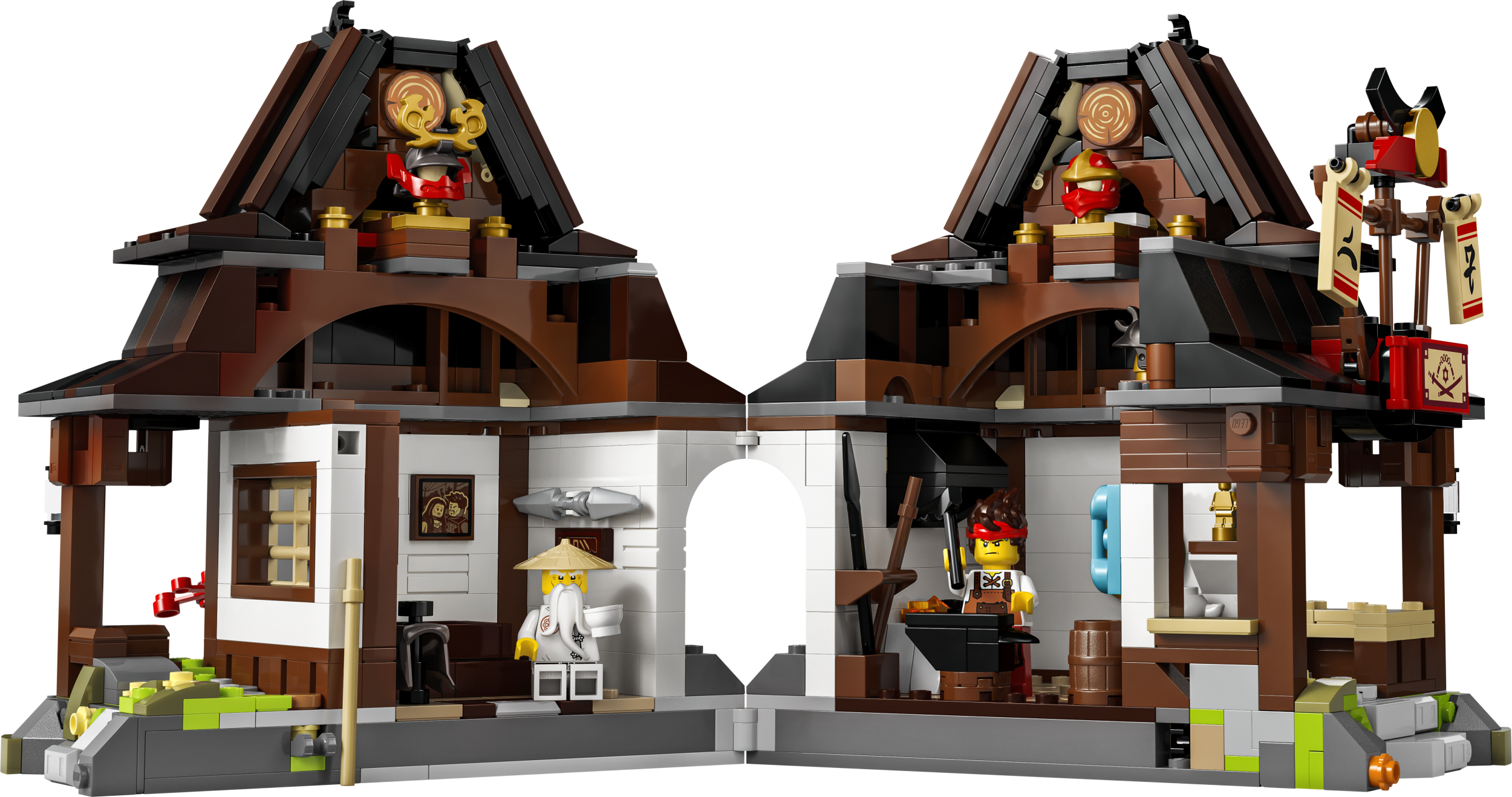 Atver nindzju rotaļlietas priekšējo daļu, kur pavērsies guļamistaba un smēde ar daudzām detaļām un piederumiem no seriāla vēstures. Bērni var atrast arī nindzju uzlīmes, kas slēpjas aiz noņemamās ķiveres un pārsega, un izspiest zīmi, kas paver skatu uz zelta ieroču karti.