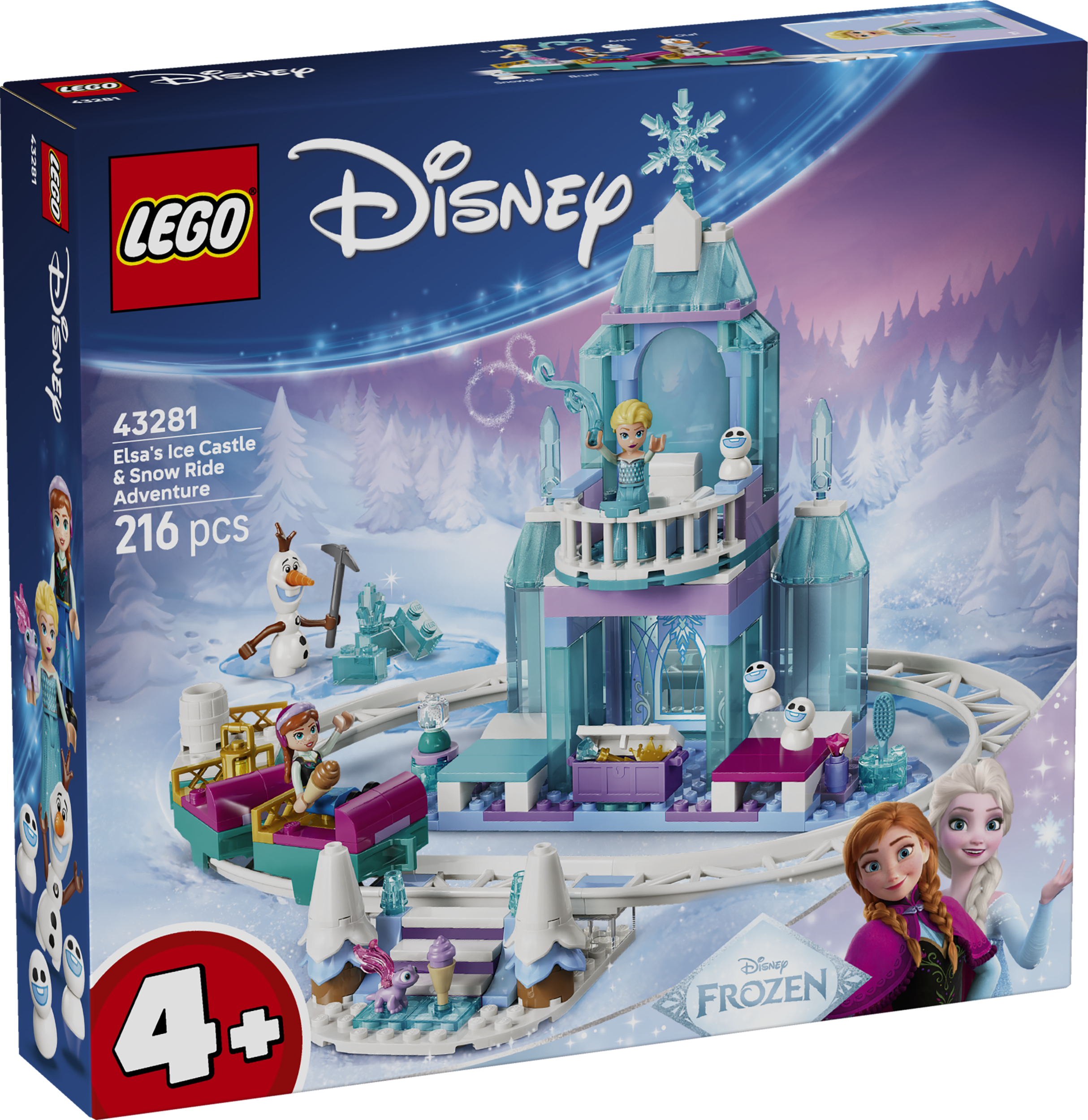 - ЗАМОК С ТРАССОЙ И САНЯМИ — в наборе «Ледяной замок Эльзы и снежная горка» (43281) есть семь персонажей LEGO® ǀ Disney Frozen, двухуровневый замок, трасса с тремя санями, лестница и многое другое.