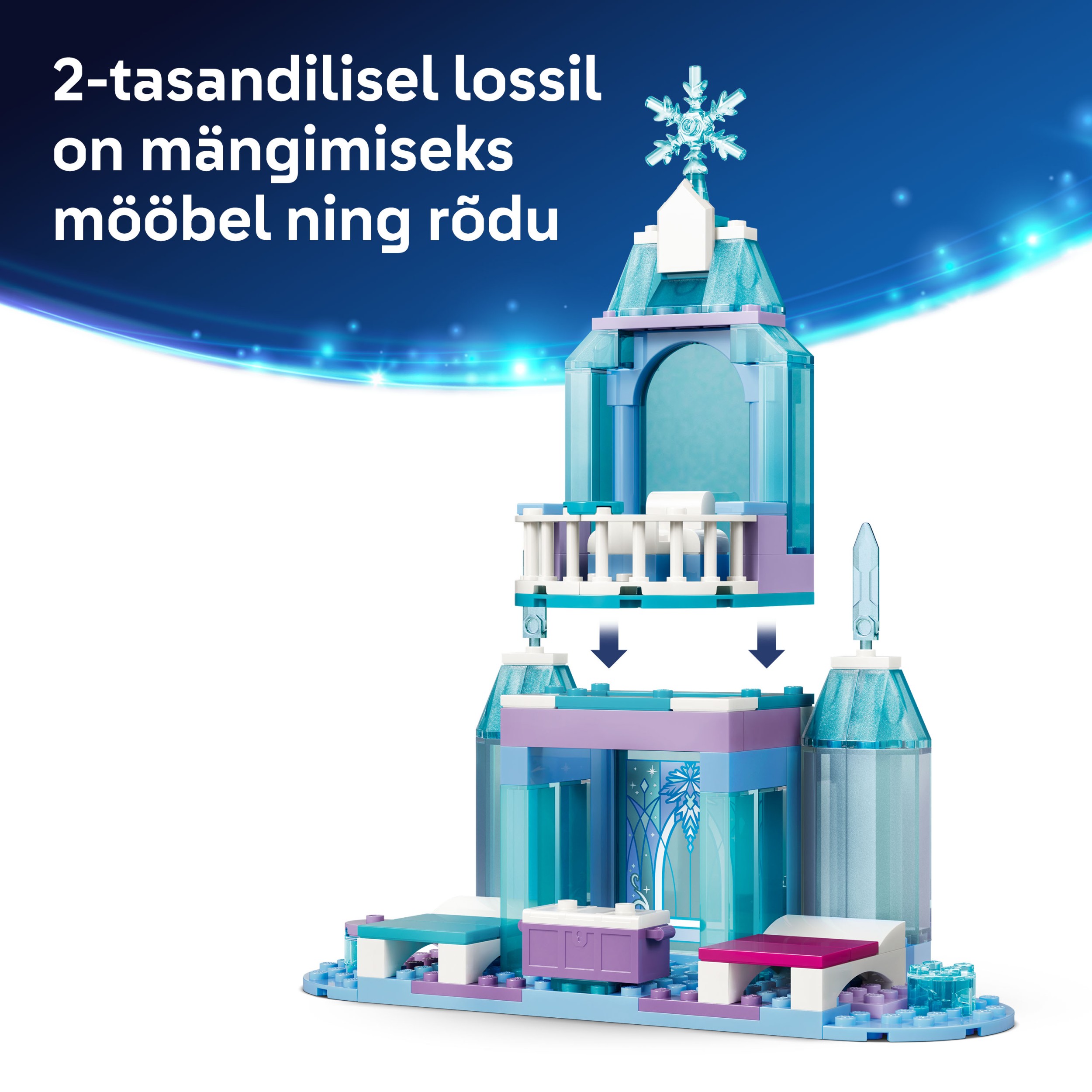 - РАЗМЕРЫ — в этом наборе из 216 деталей LEGO® ǀ Disney есть двухуровневый ледяной замок с круговой трассой для саней высотой более 21 см, шириной 28 см и глубиной 27 см.