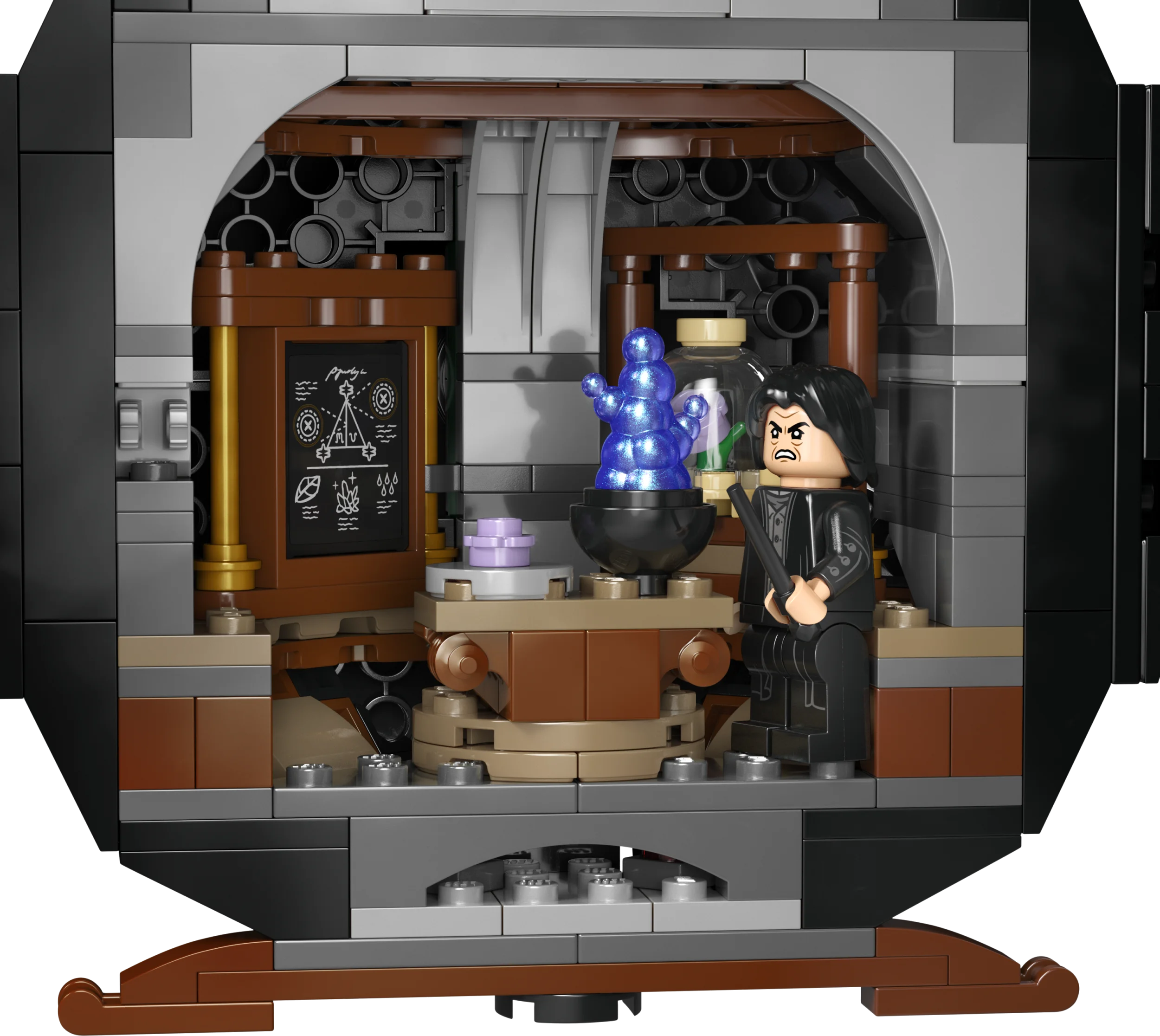 • ТАЙНАЯ КЛАССНАЯ КОМНАТА — сдвиньте палочку для помешивания и откройте классную комнату со съемными партами для удобства игры, доской, бутылочками с зельями и ингредиентами LEGO® для волчьего противоядия, оборотного зелья и любовного зелья.