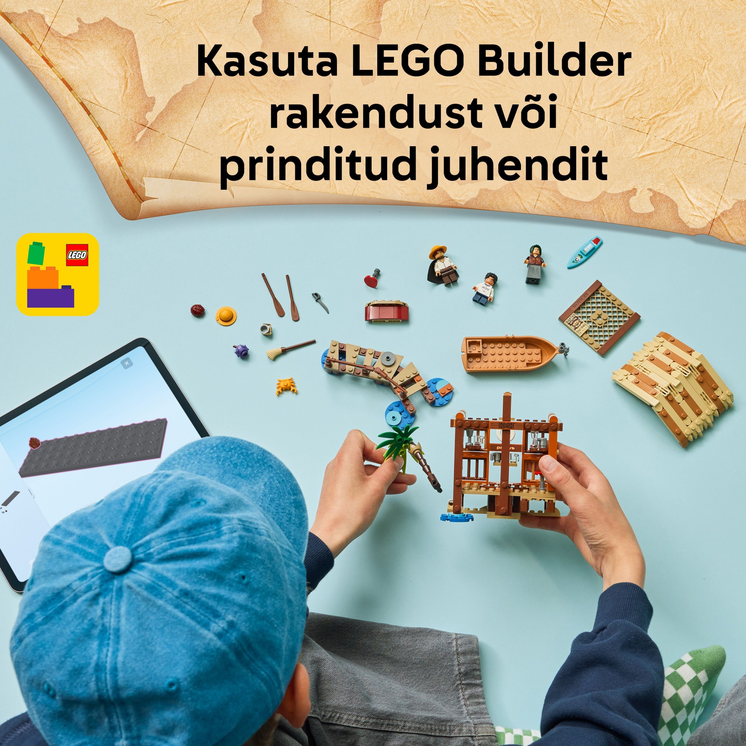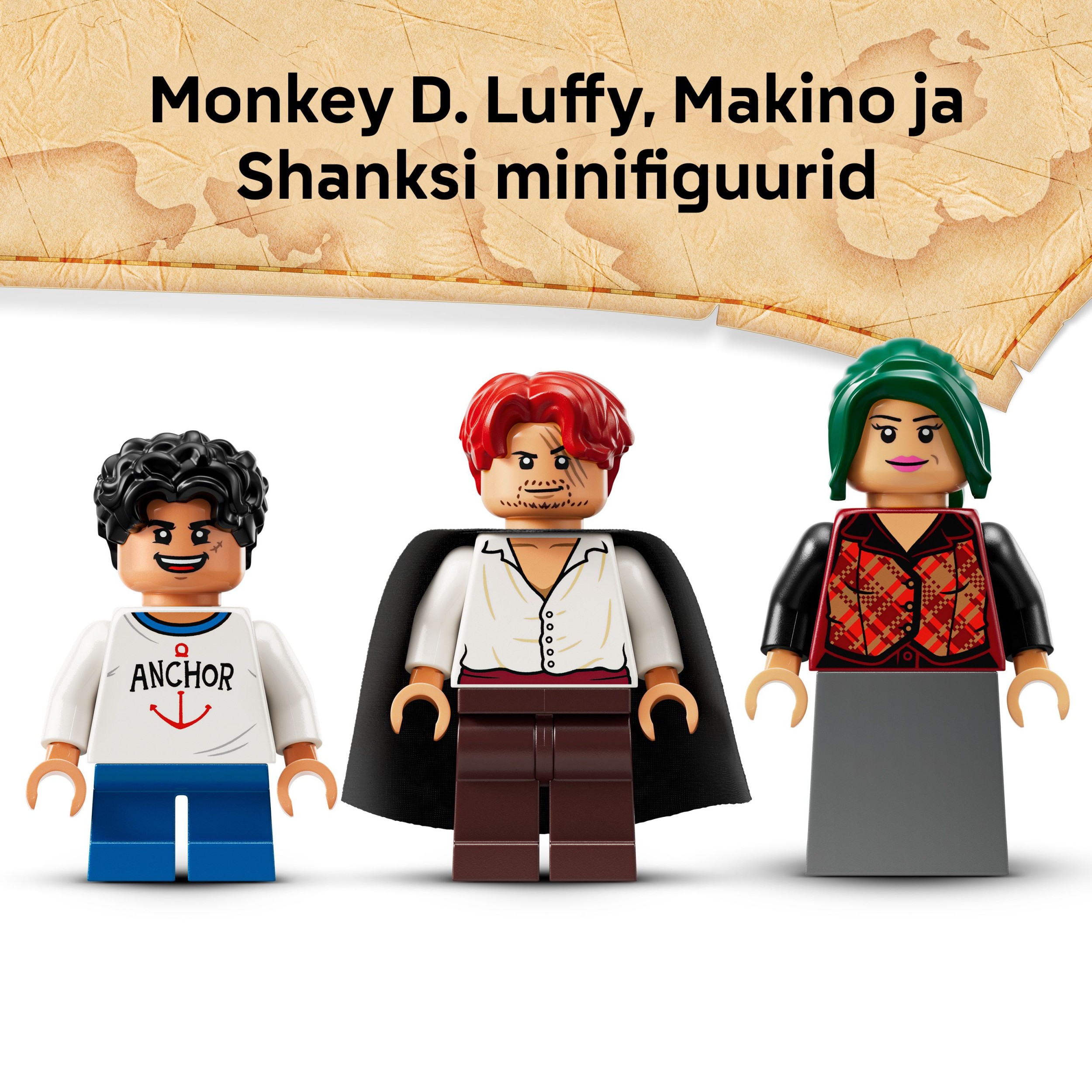 Дети могут снять крышу магазинчика на берегу, чтобы изучить его забавный интерьер. Внутри есть самые разные аксессуары для управления магазином и развлечения покупателей. На стене висит плакат «Разыскивается» и есть место для других таких же плакатов, которые можно найти в других наборах LEGO® ONE PIECE (продаются отдельно). Снаружи игрушечная пиратская лодка привязана цепью к причалу. В наборе есть минифигурки трех запоминающихся персонажей сериала Netflix — Луффи, Шанкс и Макино. Чтобы собирать было еще интереснее, строители смогут воспользоваться интуитивно понятным приложением LEGO Builder, в котором можно увеличивать масштаб, вращать модели в 3D и отслеживать свой прогресс. В наборе 299 деталей.